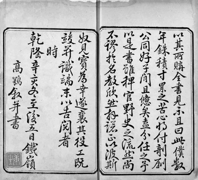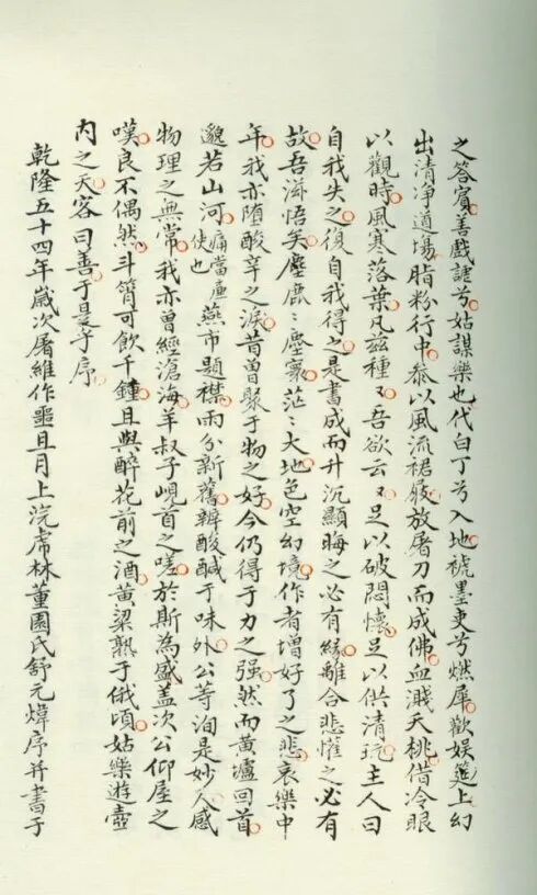 舒元炜序文落款“乾隆五十四年,岁次屠维作噩,且月上浣,虎林董园氏舒元炜序并书于金台客舍”,落款有钤印“元炜”“董园”,并有舒元炜兄弟舒元炳题词《沁园春》一首,末署“澹游偶题”,下有钤印“元”“炳”。钤印印泥颜色与句读打圈印泥颜色一致、墨色一体,笔迹一致,可以将这一实体证实为舒元炜亲手抄写的原本而非过录本,或者是原本的直接后代。