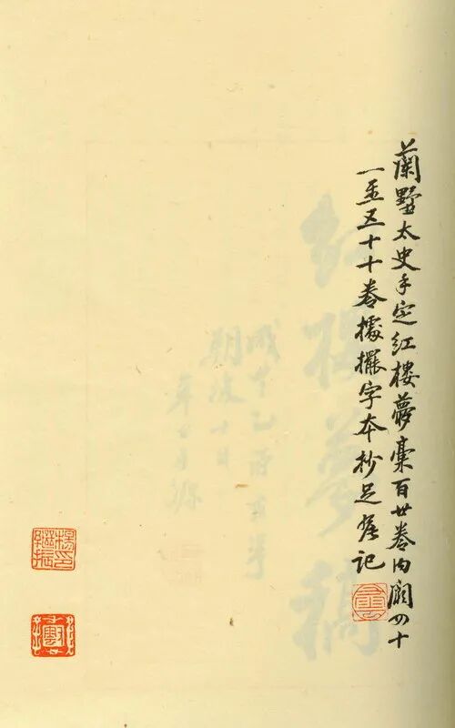 己卯本抄本的归属问题有些复杂,如今能追溯到最早的收藏者是二十世纪的名藏书家董康,之后如何辗转流入陶洙手中,我们也无从得知。但孙洙在己卯本中留下了较多的印记:陶洙在己卯本上留下五段署年题记,分别是一九三六年丙子、一九四七年丁亥,记载此残本存四十回,其中五十四、六十五回由一个叫武裕庵的人抄配,然后陶洙再对此进行校录补抄,却不想,这一好心举措为后世对此本进行研究制造了不少的障碍:他用甲戌本、庚辰本抄补情况尚可通过他的记录去分别,但朱笔旁改部分经过年岁,已经很难辨认哪些是原来的朱批、哪些是后来陶洙的补校了。