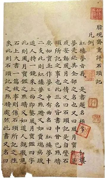 我们今天所熟知的《红楼梦》故事中,一僧一道与青埂峰顽石对话这一重要情节只有甲戌本有所保留,且只有甲戌本卷首有《凡例》。凡例,即书首说明著书首要切旨、修书体例的内容。关于《红楼梦凡例》的作者是为何人,学界的观点也是众说纷纭,不过作者为曹雪芹这一观点论据是合理的,毕竟《凡例》在影印本中的字体、置放的位置都可排除脂砚斋所作的嫌疑。而抛却《凡例》作者之谜,《凡例》指出《红楼梦》乃旧作《风月宝鉴》披阅增删而成,并定名为《石头记》,更是展现了作者于颓唐之中创作《红楼梦》的心路历程,是现今理解《红楼梦》的重要资料。