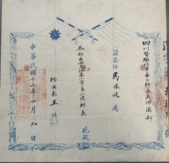 第二,这件委任状存世仅见,从委任状手填骑缝码上看,颁发总数不会超过百件以 上,但目前还只发现这一件。民国时期四川战乱颁仍,时局混乱,能保存下来绝非易事。另以出版的文献来看,查阅其相关资料,均没有刊录四川暂编陆军第七师第三梯团部颁发的委任状文献图片。
