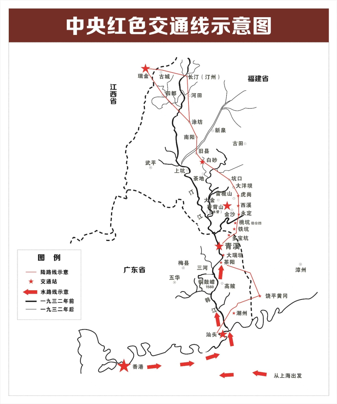 1930年冬,为了便于上海中共中央与中央苏区联系,打破国民党反动派对中央苏区的反革命“围剿”及严密的经济封锁,中共中央建立了一条自上海、至香港,过汕头、潮州,转大埔,进入闽西,到达瑞金的长达数千里的秘密交通线,史称中央红色交通线。