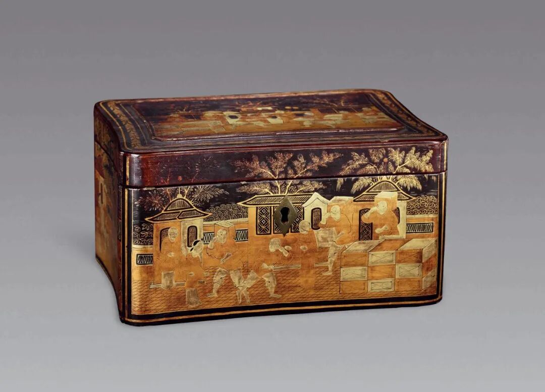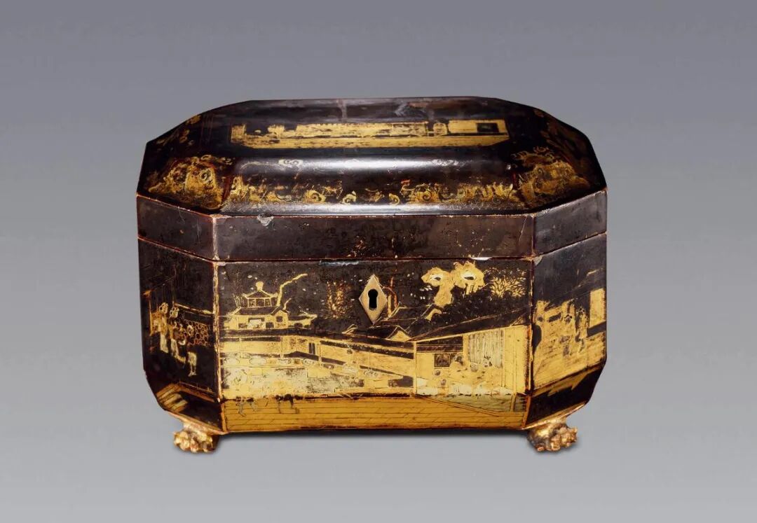 清朝以降,广州商人利用本地广式家具、髹漆工艺的优势,与当时欧洲流行的洛可可风格相结合,生产出了大量的外销黑漆描金漆器。尤其是黑漆描金茶叶盒,充分利用了漆器的防水功能,又适应了当时欧洲中上层的审美风尚,实现了装饰效果和实用价值的高度统一。这些黑漆描金漆器不仅见证了广州外销品的发展历史,更促进了中西方文化的交流融合。