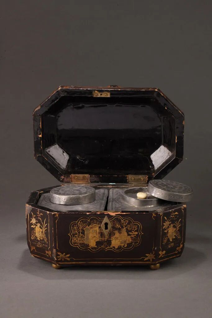 茶叶盒一般与锡器相配、带锁,形制多样。内置锡胆数量不一,有单一的茶叶箱,也有两个或是三个茶叶罐。19世纪30年代以前的茶叶漆盒以相对瘦高的八边形为主。在这之后一直到19世纪后半叶的茶叶漆盒则发展成相对矮平的八边形或长方形,其设计风格更为华丽,甚至在盒子底部装饰有龙爪形状的底座。