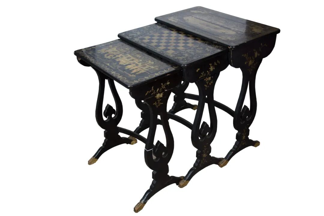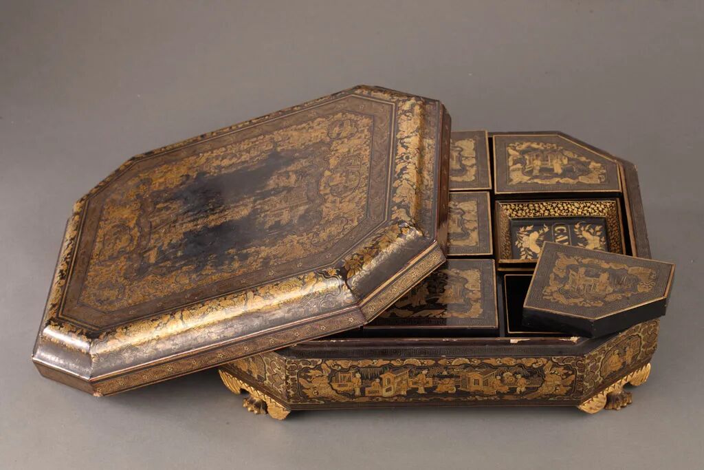 出口到欧洲的黑漆描金家具种类多样,不仅有壁橱、桌子、屏风,还有游戏盒、针线盒、女红桌、茶叶罐等。十九世纪时,洛可可风中的曲线、卷纹等典型元素在广式家具中被广泛运用。同时,这种装饰技法,更突出了黑、金两色的对比效果,更添异域风情。