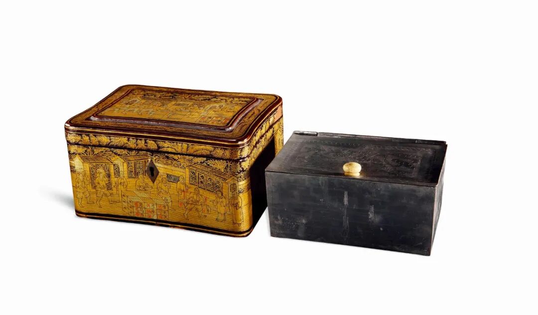 尤其是茶叶盒,中国传统就有在海上运输中使用漆器箱保存茶叶的手段。但这些漆木箱以实用为目的,因而在花纹上尽可能朴素。直到清中期,茶叶盒与洛可可风格相结合,使用黑漆描金技法装饰器身,它的审美文化功能逐渐凸显。换句话说,这类黑漆描金茶叶盒的出现本身就是洛可可风传入中国的直接体现。茶叶盒上的黑漆描金技法使得整件器物奢华异常,刚好迎合了当时欧洲流行的洛可可风尚,配合时价高昂的茶叶,我们可以想象到欧洲中上阶层的饮茶热潮。