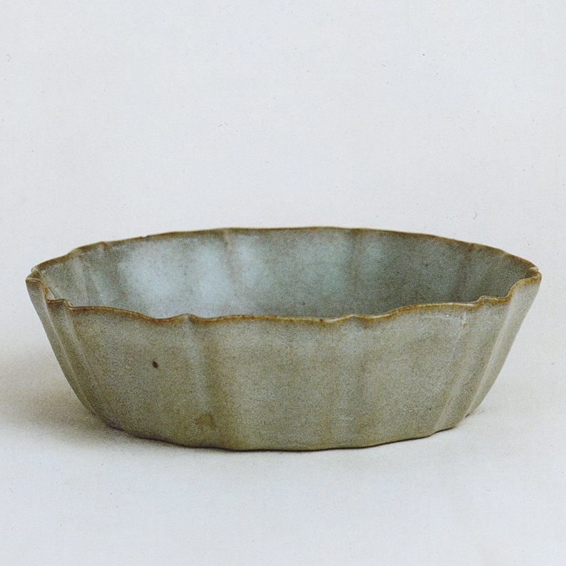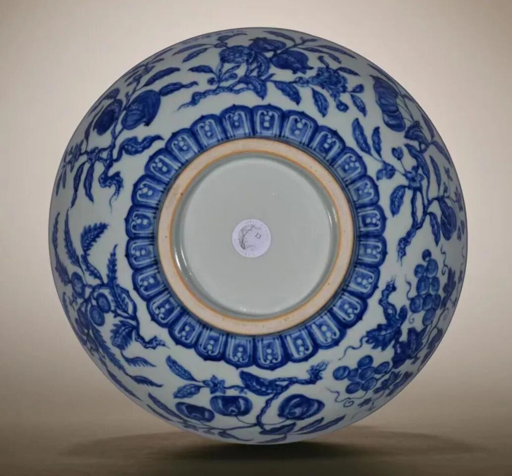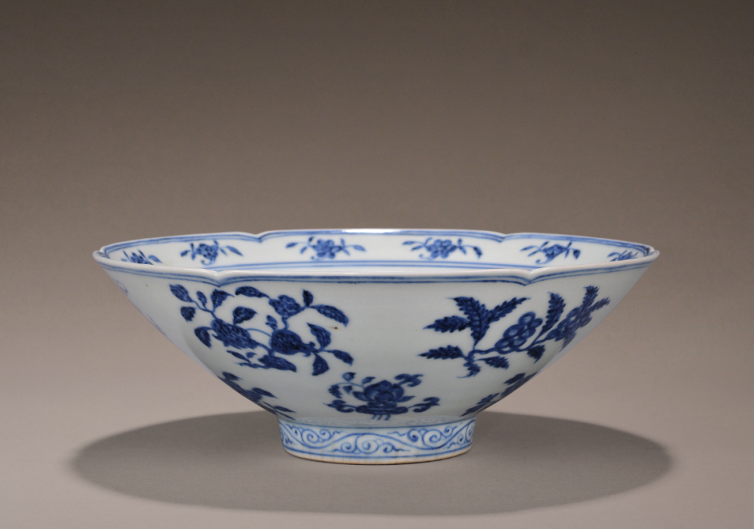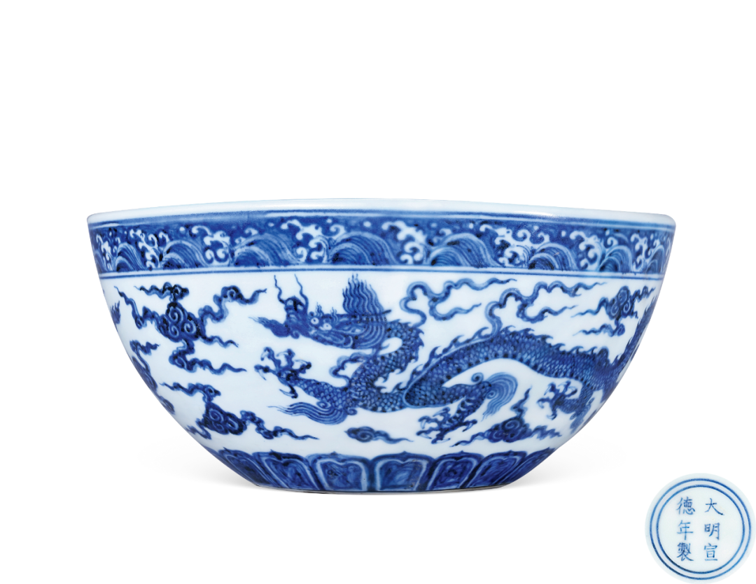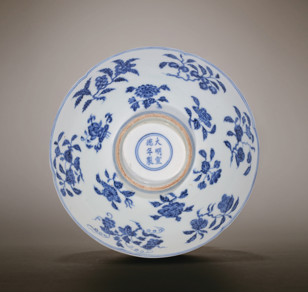 此洗妙作十瓣花式,花瓣边沿于中微敛,颇似蜀葵,故常名葵式洗。明永乐时期复烧十棱洗,见甜白及青花两种。景德镇永乐地层曾出土甜白釉十棱洗残片,首都博物馆珍藏一永乐青花十棱洗,洗内绘龙纹,外壁饰团龙,尺寸最小,直径仅15.7厘米。宣德时期承继了这一制式,惟足内不再绘五爪飞龙,代之以宣德六字款。景德镇可见出土复原器,台北故宫亦藏有数件。