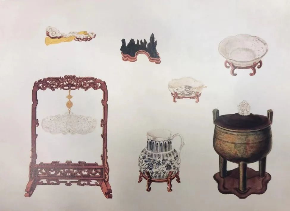 清宫内务府活计档中,此类洗有“葵花洗”、“葵花式洗”等名。作为“宣窑”佳器,葵式洗多配以木座陈列赏玩,也为大臣们作为珍品进贡。乾隆四十六年十二月初八日,员外郎五德、催长大达色、舒兴来说太监鄂鲁里交:红雕漆小格一对,内一格盛:……宣窑青花白地十龙洗一件(木座)……传旨交汤泉安设钦此。