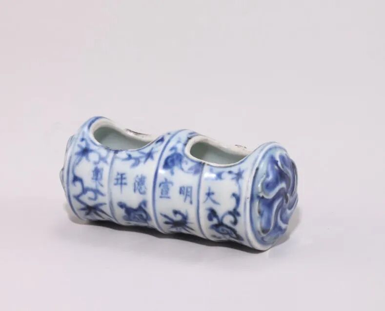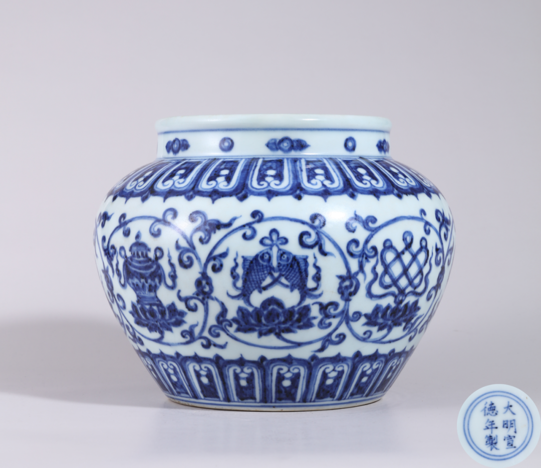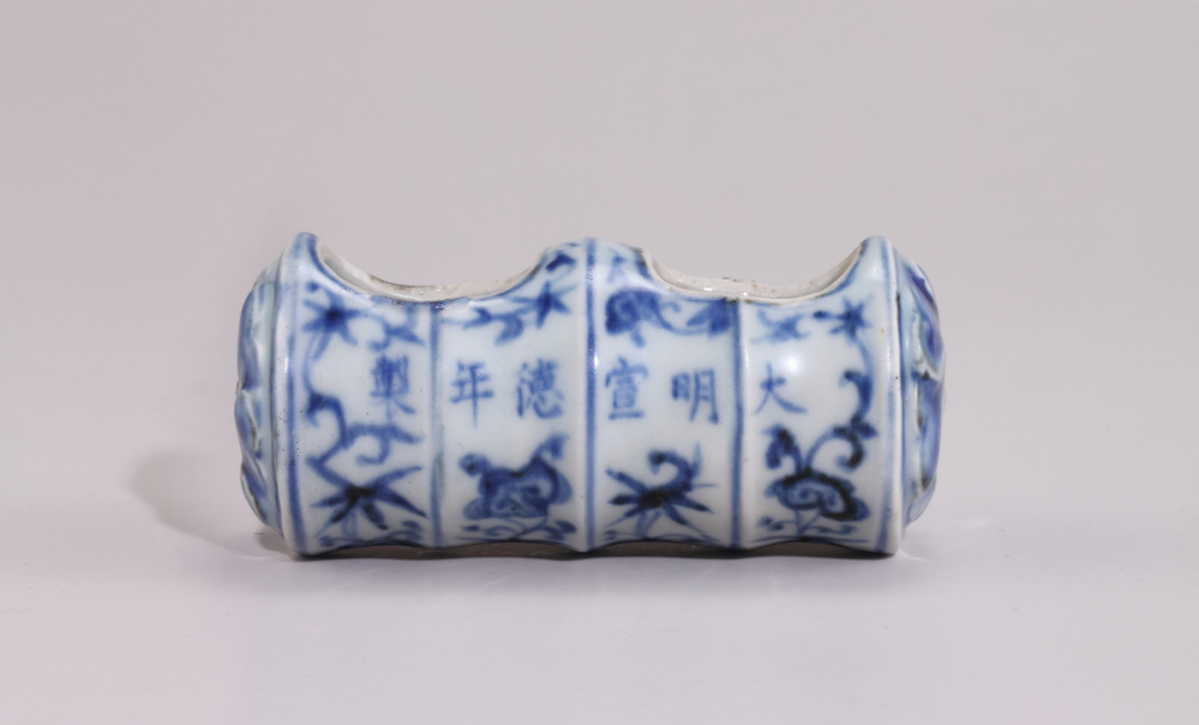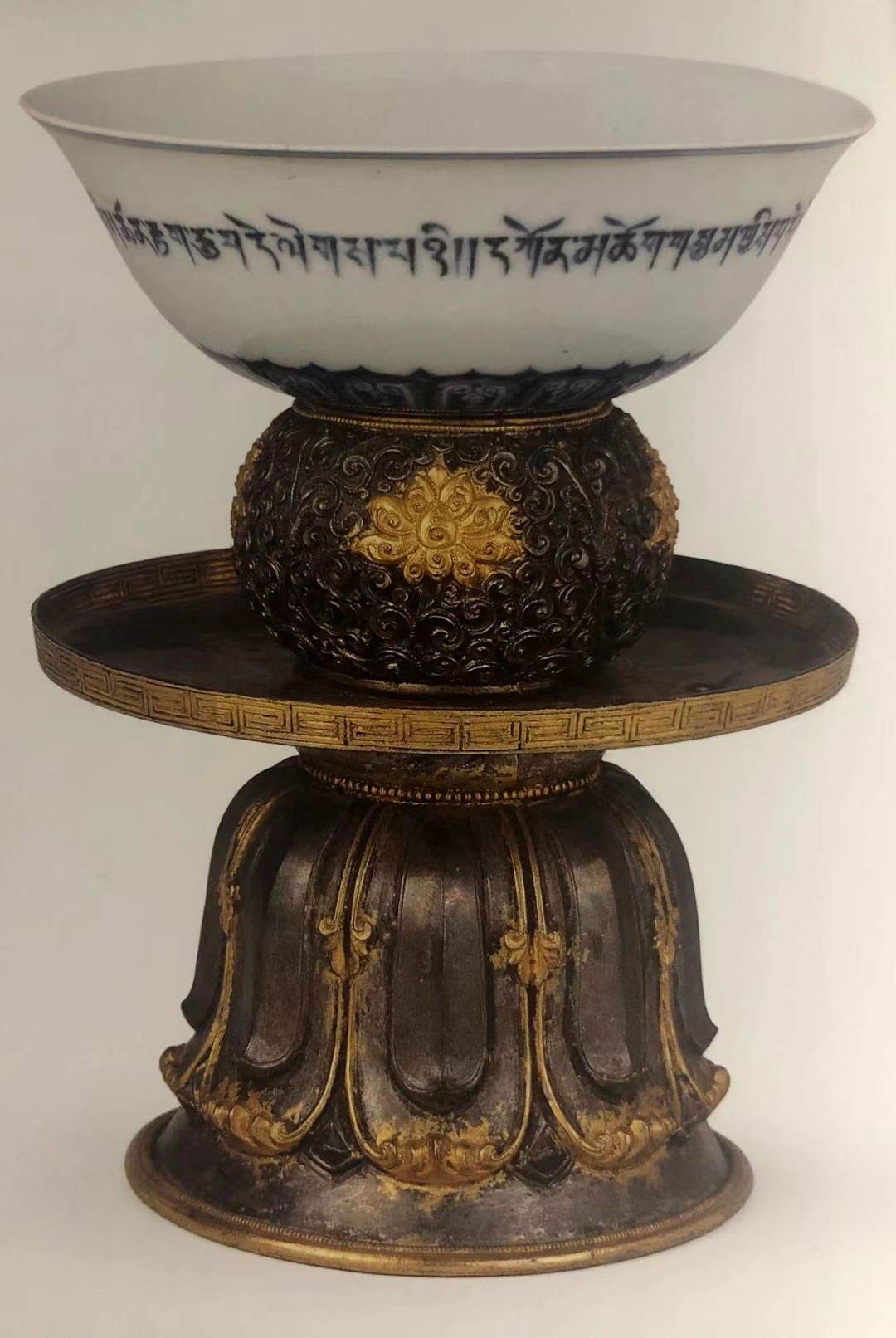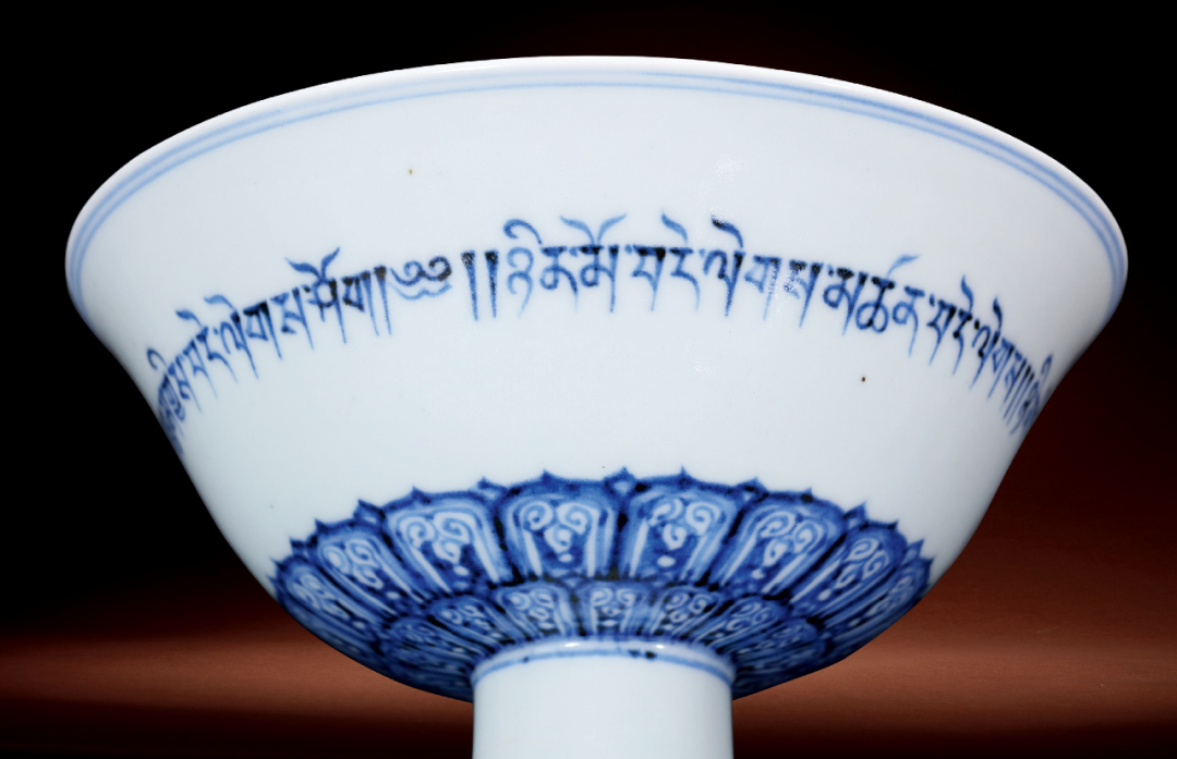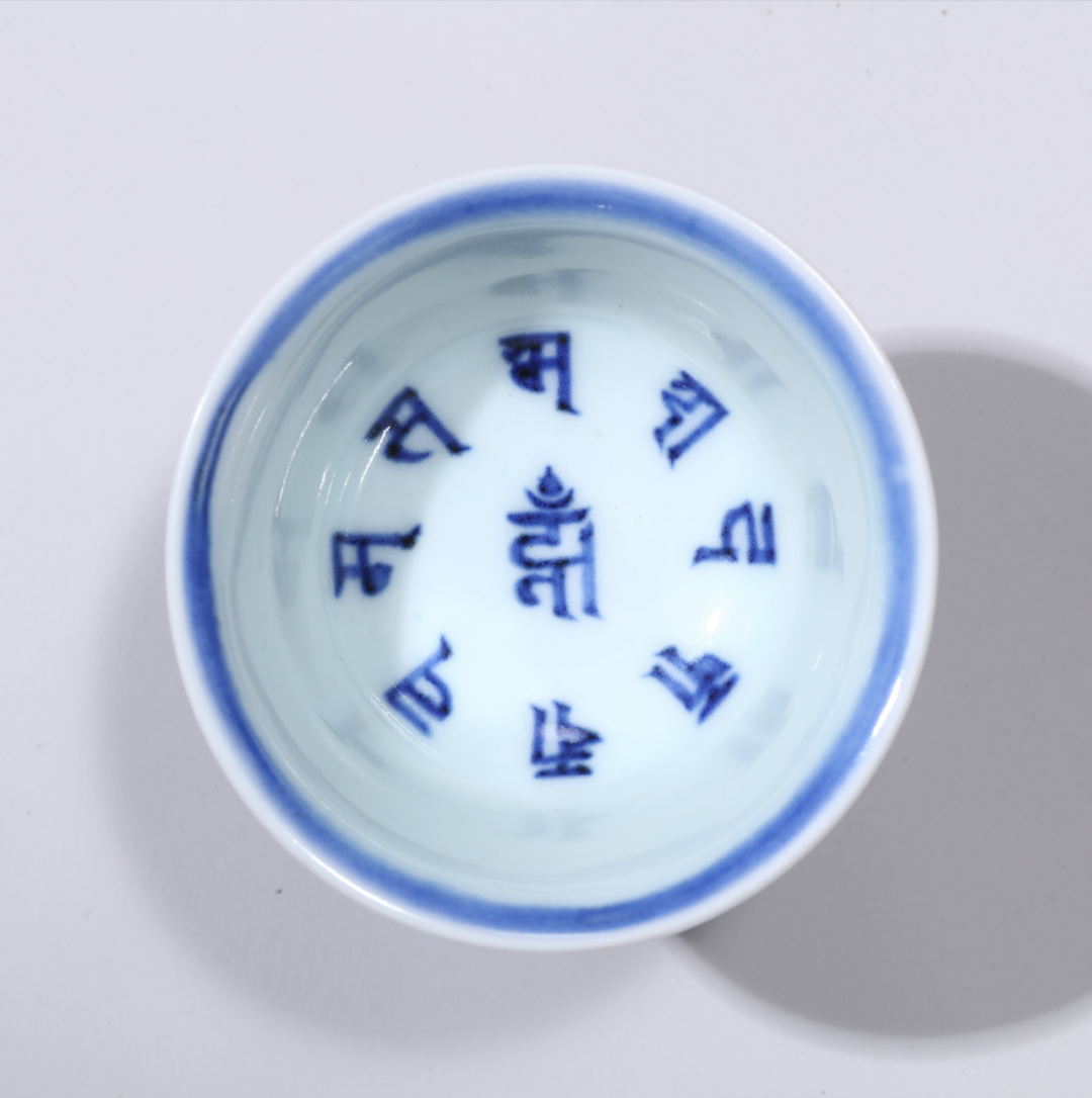 宣窑礼器多以青花瓷取代前朝单色白瓷,如书藏文佛咒者,前朝仅见甜白釉器,宣窑却有如本品这般以青花作饰之例,甚为珍罕,无疑是北京宫廷为赏赐西藏上层僧侣而特制,抑或用于内廷佛堂供奉。经文内容汉文可翻译为「日平安,夜平安,阳光普照皆平安,日夜永远平安泰,三宝护佑永平安」,该经文为藏地祈颂平安吉祥的重要经典,各大教派均有念诵,藏传佛教信徒认为,「常时行此烧香供施,现世灾难消除,究竟证得四身佛位,利益甚大」。亦有译为:愿昼吉祥夜吉祥,昼夜六时恒吉祥,一切时中吉祥者,祈愿三宝皆吉祥。