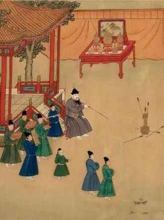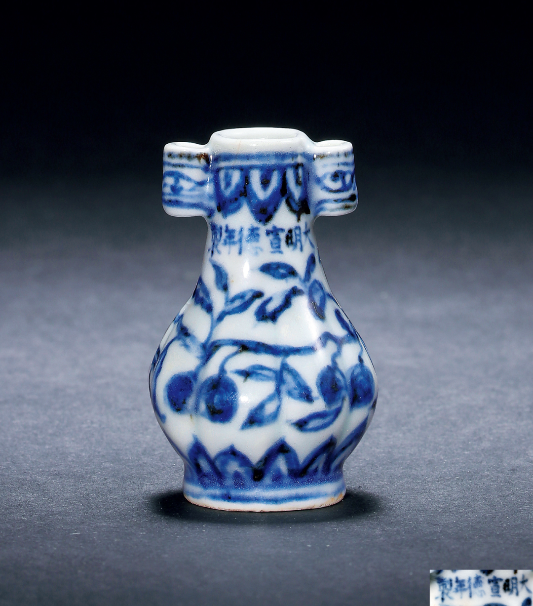 1646年皇太子朱瞻基即位,改元宣德,宣德时期出现了明朝建国六十年以来“蒸然有治平之象”的太平盛世,后世称为“仁宣之治”。宣德皇帝自小聪睿,晓谙兵事,又锐意文治,好作诗文,有御制诗集传世,尤爱书法绘画。明韩昂《图绘宝鉴续编》云:“宣庙御笔有山水、人物,有花果、翎毛,有草虫,上有年月及赐臣名。”其他书画的天赋可与宋徽宗媲美,明钱谦益《列朝诗集小传》评道:“帝游戏翰墨,点染写生,遂与宜和争胜。”朱瞻基还以恢复北宋徽宗宣和画院为目标,吸引诸多名家入宫隶属于仁智殿和武英殿供职,即“宣德画院”,它一扫元人影响,代之以两宋风骨,促就了明初宫廷艺术的发展风格,并为宣德青花的发展提供了可以借鉴的艺术蓝本。