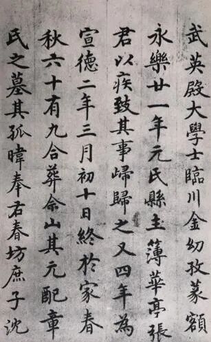 宣德款识既近于宣宗御笔,也与沈度之书风十分接近。可能由宣宗或沈度书写粉本,后交景德镇工匠临摹于瓷器之上。明初,以沈度楷书为代表的台阁体书法作为书法规范,影响至为深远。明初重臣杨士奇盛赞沈之楷书曰“婉丽飘逸,雍容矩度”,且“凡玉册、金简,用之宗庙朝廷,藏秘府,施四裔,刻之贞石,传于后世,一切大制,必命度书”。明宣德皇帝之书风亦深受其影响:据明王世贞《艺苑厄言》载,“宣宗书出沈华亭(度)兄弟,而能于圆熟之外,以遒劲发之。”由是,器底落款与宣宗、沈度二者书法皆相近,可谓顺理成章。之于具体出于谁之粉本,尚待考证。将《一笑图》画中宣德元年宣宗御题,与是次展览之数例宣德青花展品的年款详加对比,便会发现此写款的风格脱胎于宣宗笔意。同时,沈度墨迹《张桓墓碣铭》中的“大”、“宣德”三字所写亦非常相像。