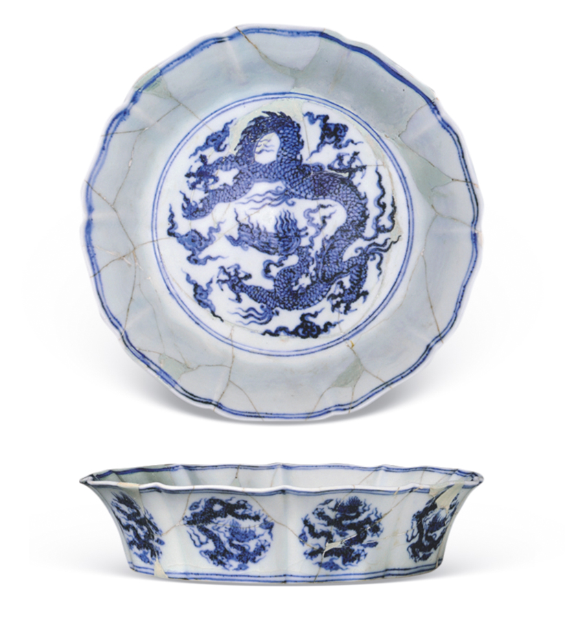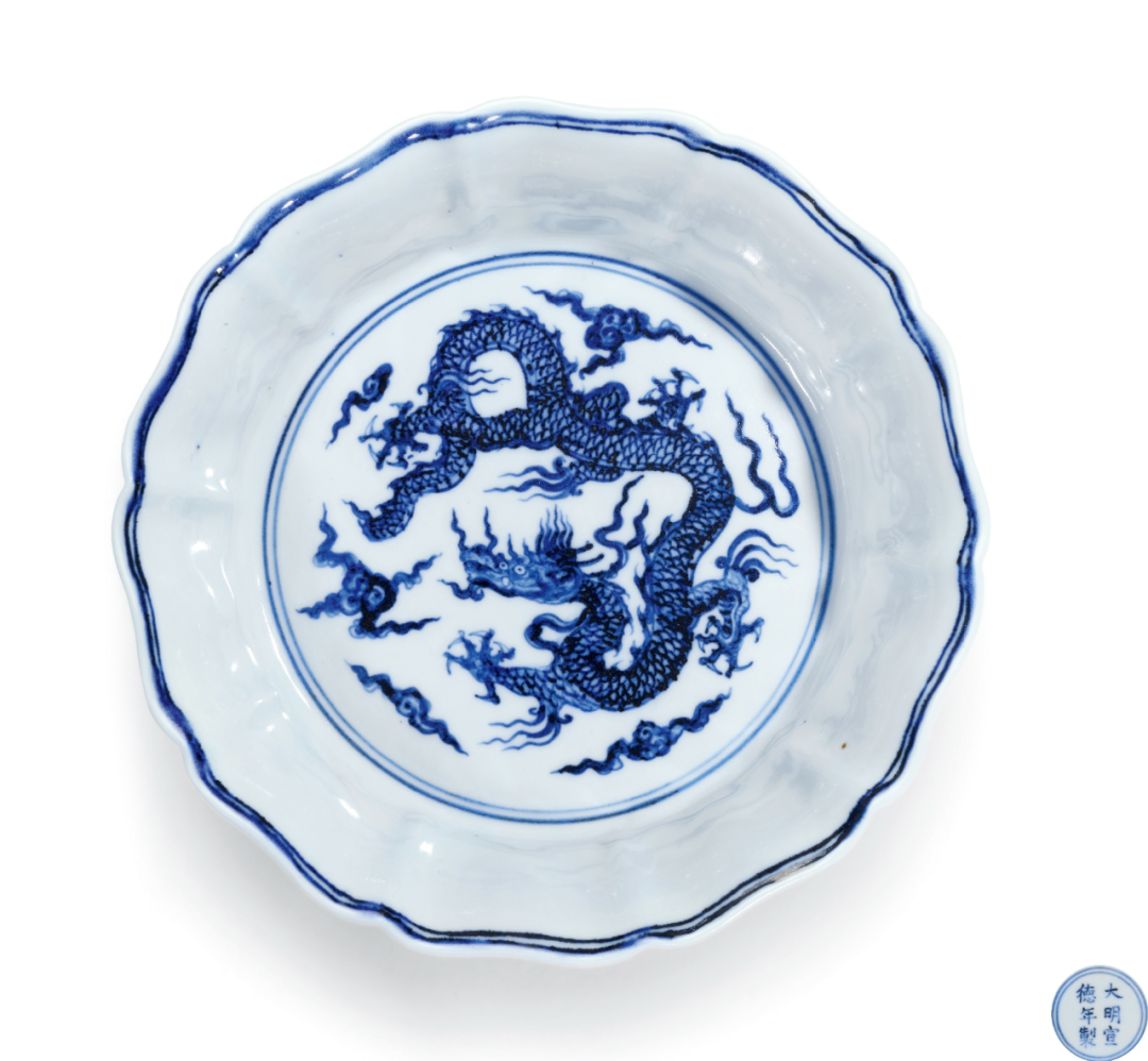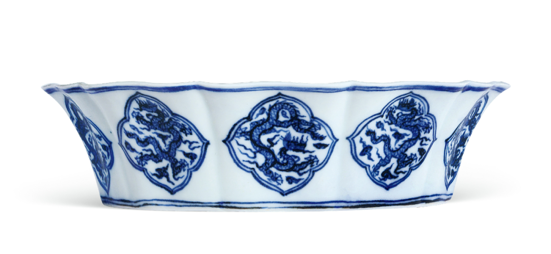 本品呈葵瓣花口十棱式,浅壁,至底微敛,底心微凸。考其形制当为印模而成,凡印器入窑遇火容易疵裂变形,完好者百中不得一二。内底心青花双圈内绘一五爪降龙穿梭于祥云之间,灵动活现中不乏威严。外壁十组菱花形开光,每一开光内均绘有一团龙,整体组合主次统一,相得益彰。