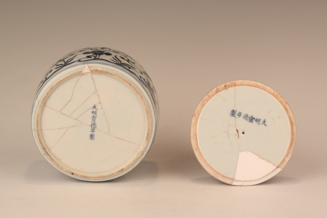 明宣德 青花莲池鸳鸯纹蟋蟀罐