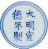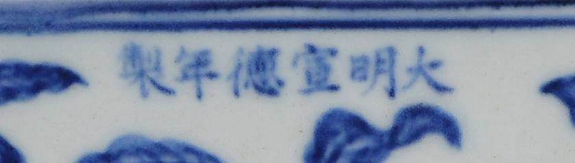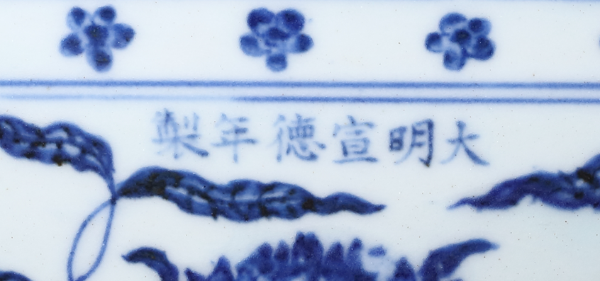 宣德青花的款识亦独具特色,宣德朝已将御用瓷器上署纪念款作为一项制度而要求御窑厂贯彻执行,可谓开一代之先河,自此时期后开始瓷器便盛行书帝号款。宣德瓷器创新品种繁多,落款方式花样迭出,根据器物的造型的不同而变化,故而有“宣德款识遍器身”一说。孙瀛洲先生有歌云:“宣德年款遍器身,楷刻印篆暗阳阴。横竖花四双单圈,晋唐小楷最出群。”如本次展品之【明宣德 青花永平安颂高足碗】,为宣德早期制品,尚保留永乐篆法遗风,于碗心之内暗刻“宣德年制”篆书款;而展品【明宣德 青花梵文海水异兽纹高足杯】于底足方寸间书“大明宣德年制”六字双行楷书款,亦见佳趣。展品【明宣德 青花云龙纹十棱葵瓣式洗】亦于底足青花书“大明宣德年制”六字双行楷书款。另亦见于器物口沿书写款识的,如展品【明宣德 青花缠枝花卉菊瓣纹花浇】、【明宣德 青花折枝花果纹大碗】均于口沿以青花书“大明宣德年制”六字单行楷书款。