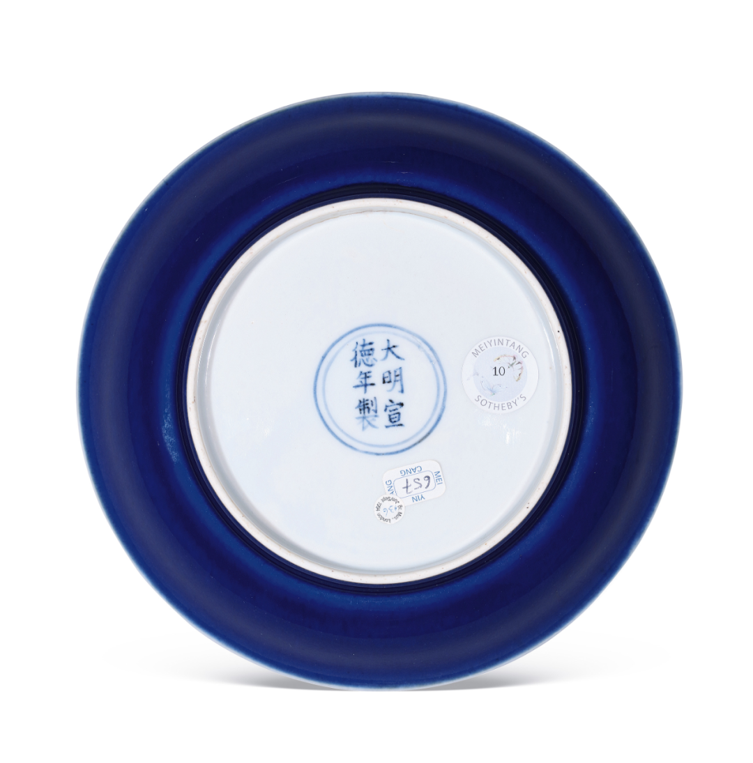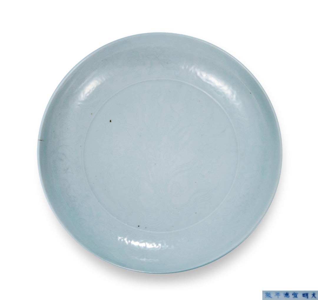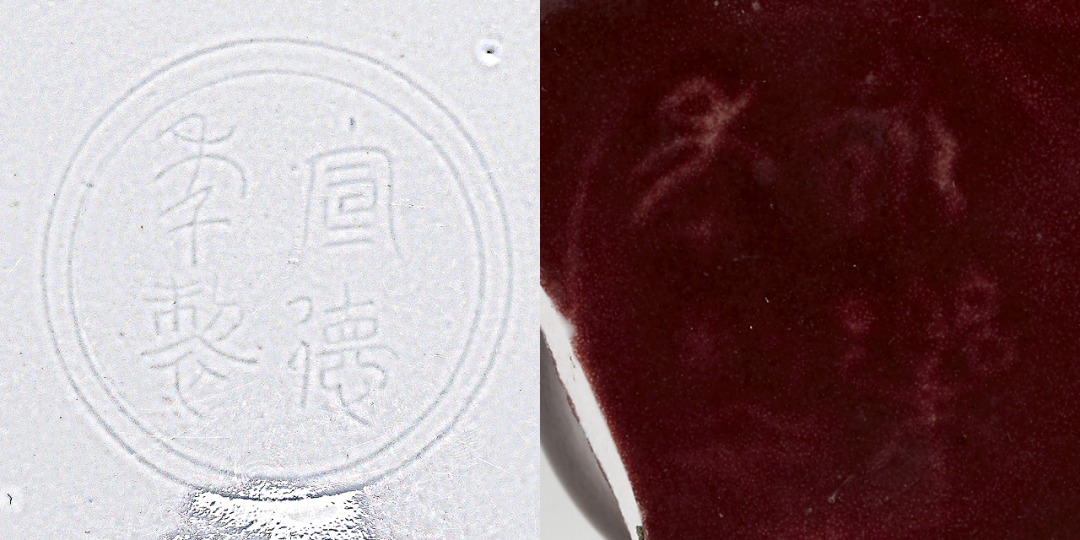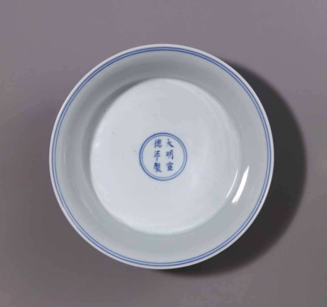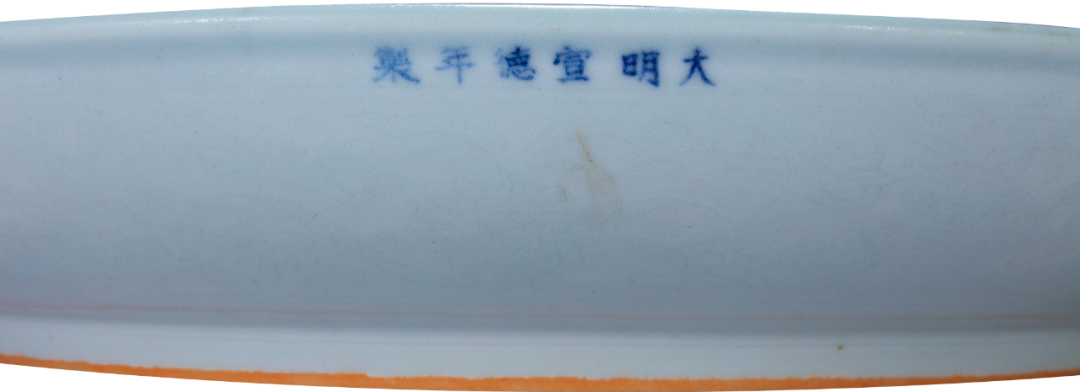 宣德御窑楷书款识出自明初著名书家沈度之手已为学界所公认,与永乐官窑瓷器年款仔细比较后可发现,二者风格完全一致,故此式年款当由沈度书写后,再交景德镇御厂,由工匠们按墨迹移到瓷坯上。景德镇御窑厂曾出土一例「明宣德 天青釉高足碗」,碗心青花书「宣德年制」篆书款,书法风格与本品一致,亦可为参照。与本品相同的,现仅知台北故宫博物院、西藏布达拉宫管理处各珍藏一例,殊为珍罕。
