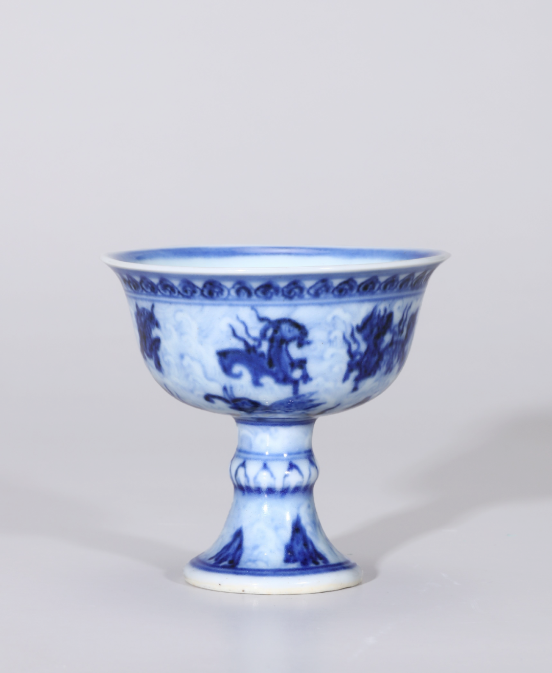 宣德青花所使用的原料与元代、永乐相同,皆为波斯地区进口的“苏麻离青”钴料,含高铁低锰,经高温烧成后,青花呈色浓重艳丽,釉面上常遗有高铁所留下的褐绿色斑、或褐黄、铁褐结晶疵斑,斑处偶有下陷迹象,釉色浓淡不一、有层迭堆积之感,墨趣浑然。1993年在明御厂宣德地层出土的一块青花书“乐一号”、“乐三号”铭青花试料盘,该盘青花色调淡雅,所谓“乐一号”、“乐三号”可能就是乐平青料(即文献记载的所谓陂塘青或平等青),可见宣德时期已开始使用江西乐平所产平等青。如展品【明宣德 青花梵文海水异兽纹高足杯】的海水部分就以平等青绘就,异兽纹及杯心内梵文则以进口钴料绘制,浓淡间可见墨趣。至中晚期,为中和高铁低锰的进口钴料铁斑、晕散的难题,工匠便以国产青料与进口青料混合搭配使用,由于青料中减少了钴铁着色而增加了钴锰着色,故形成纯正蓝色中“略带紫色调”,使得线条不晕散、呈色趋于紫灰。这就是宣德青花既不同于、而又胜于前朝的原因。此后便开始大规模使用国产青料生产。