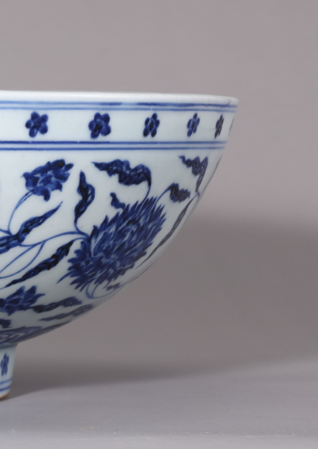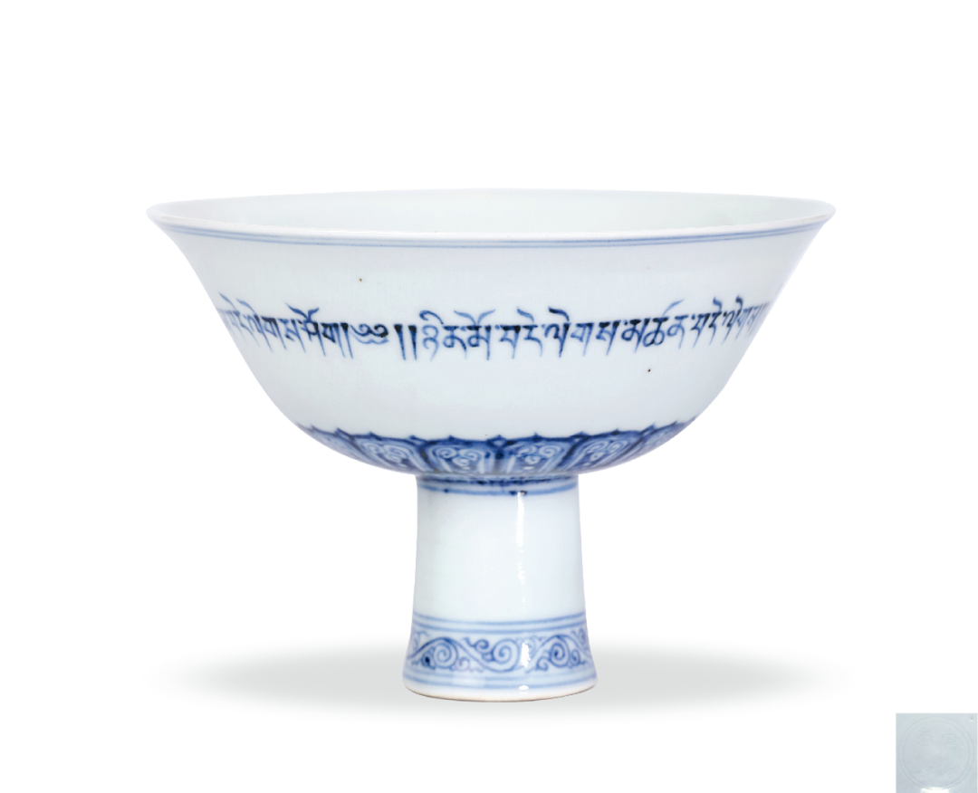 本品撇口,弧壁,高足中空,通体施釉肥厚,釉色明润。外壁仅于碗壁中线处以青花书写藏文「平安颂」经文一周,外壁下部绘仰式莲瓣纹一周。这时期已大量使用进口苏麻离青优质钴料,青花发色苍雅淋漓,铁斑沉着,时代特征鲜明。碗心以暗刻技法于双圈内篆书「宣德年制」四字两行款识,与寻常所见楷书宣德年款颇为不同,而与见于个别永乐甜白釉的暗刻篆书「永乐年制」款识极为接近,可见本品当烧造于宣德早期。