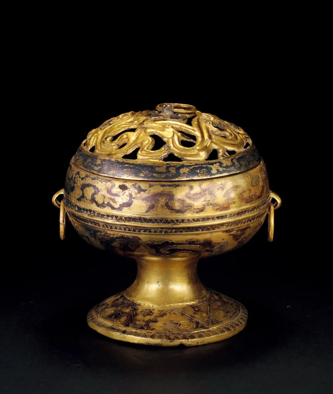 秦或西漢 銅鎏金鎏銀鏤空雙螭龍蓋爐