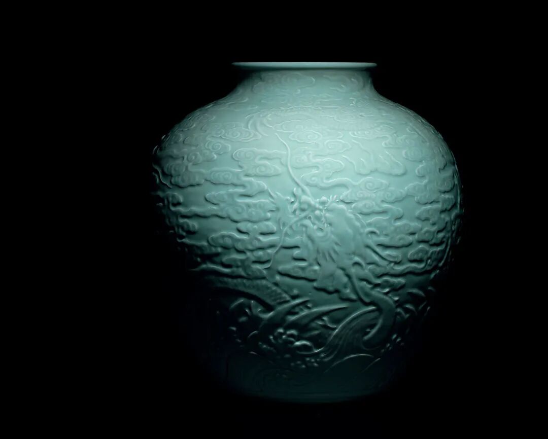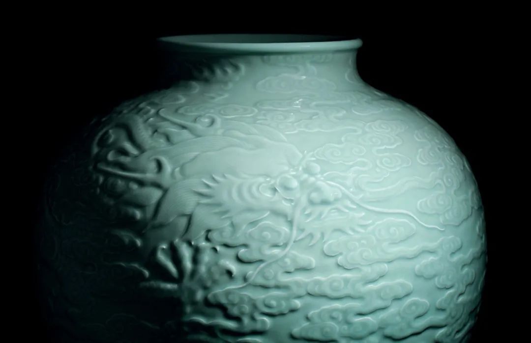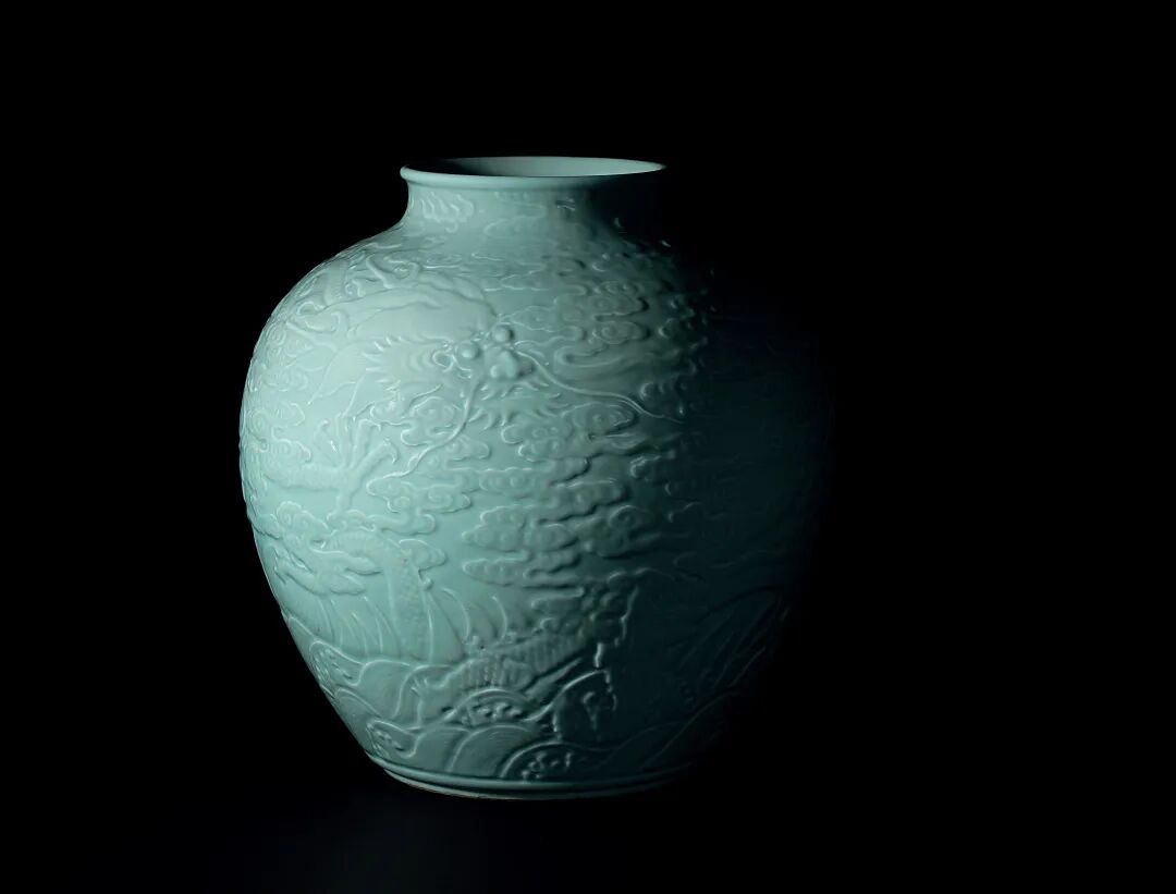 清乾隆 粉青釉浮雕「蒼龍教子」圖大罐