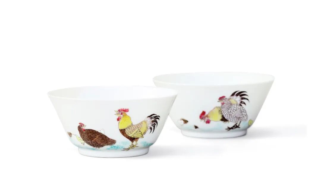此雍正雞缸杯,承襲明十五世紀成化器形,然繪風破舊立新,以意創造,甚為稀有。杯為一對,杯外以粉彩繪子母雞圖。此對杯彩施色精絕,雞羽之處等筆觸細微,類有畫琺瑯之感,頗為傳神。底落「大清雍正年製」青花三行六字楷書款。
