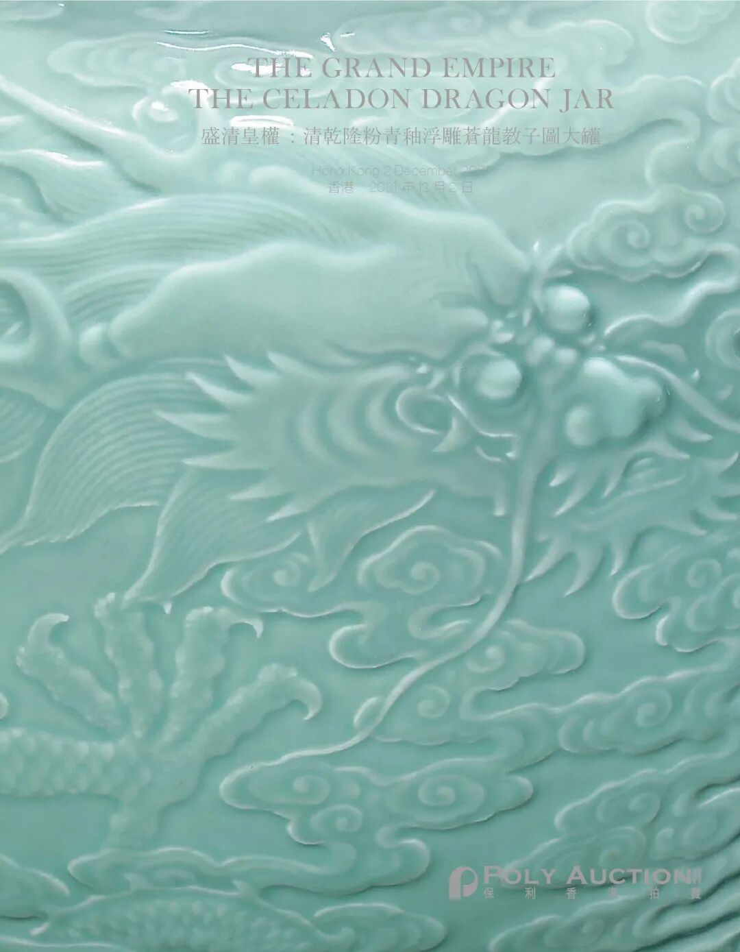 「盛清皇權」專場欣呈清乾隆粉青釉浮雕「蒼龍教子」圖大罐,此器來自亞洲顯赫私人收藏,藏家早於80年代活躍於國際拍場,積極建立個人收藏,本罐即為藏家於1987年香港蘇富比首批納入收藏的重要作品之一。