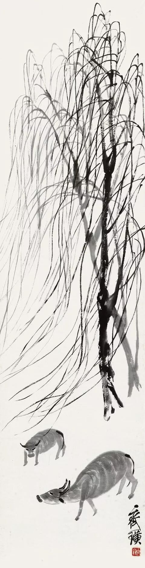 不知道为何,从今天存留的齐白石画牛的作品来看,这些牛大多都是没有脸的。多是从牛的背面描写,屁股或者尾巴占了整个画幅的主要位置。