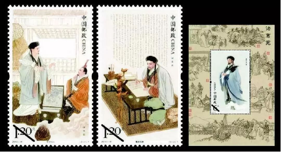 2014年8月28日,中国邮政再次发行三国题材人物邮票——《诸葛亮》特种邮票一套2枚,小型张1枚。邮票内容分别为“卧龙出山”、“鞠躬尽瘁”,小型张内容为“诸葛亮像”。