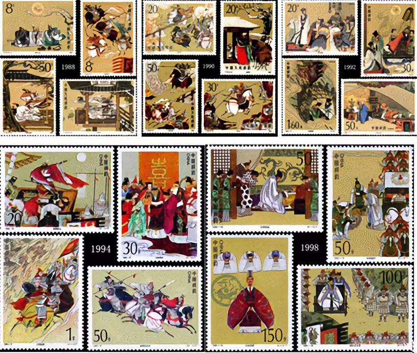 第一组诞生于1988年,内容包括:桃园三结义、三英战吕布、凤仪亭、煮酒论英雄和千里走单骑(小型张)。