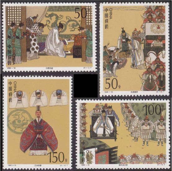 1998年出了第五组,内容包括:白帝托孤、孔明班师、秋风五丈原、三分归晋和空城计(小型张)。