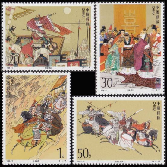 1994年出了第四组,内容包括:横槊赋诗、刘备招亲、威镇逍遥津、火烧连营和赤壁鏖兵(小型张)。