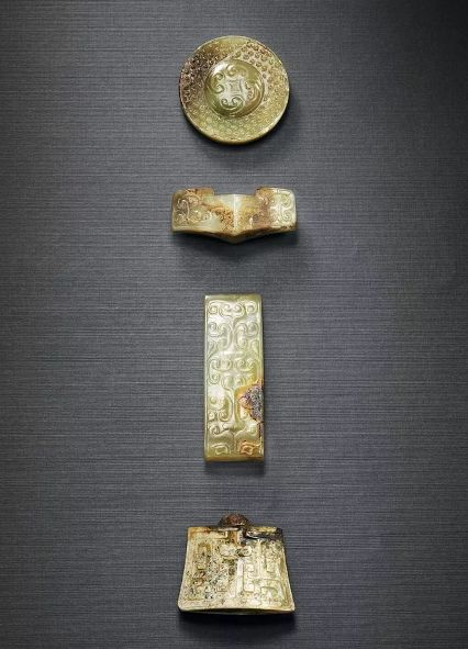 战国至西汉 玉卷云纹剑饰一套三件及玉剑珌一件(35万)