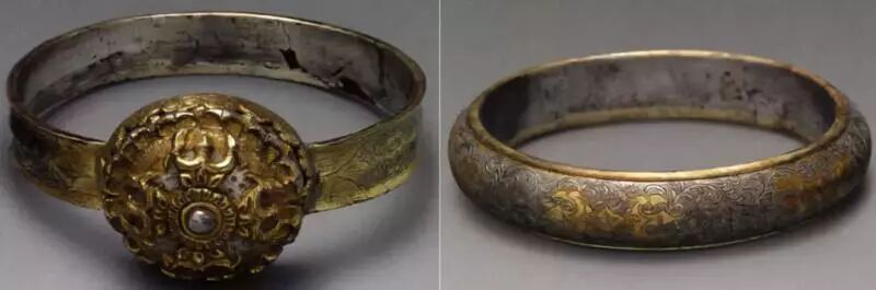 还有一种叫做“跳脱”的臂环,如弹簧状,盘拢成圈,少则三圈,多则十几圈,两端用金银丝编成环套,用于调节松紧。这种“跳脱”式臂环,可戴于手臂部,也可戴于手腕部,在自由开放的唐朝得到了空前的发展。