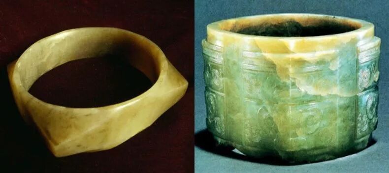 这个时期的玉镯为扁圆形,材料多为玉石。有学者认为玉璧和玉琮[cong]作为手镯的原型比较可靠。