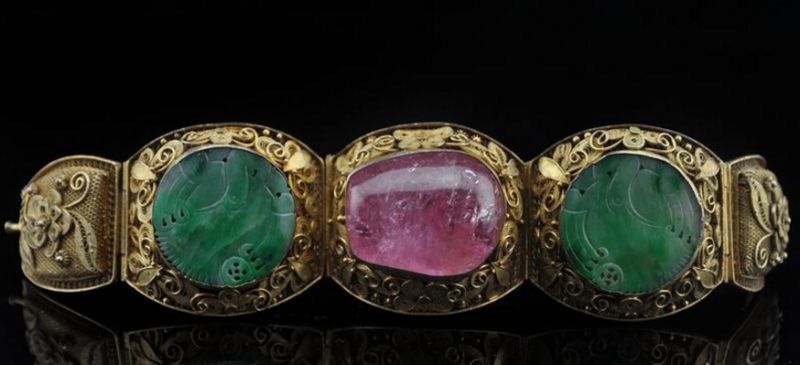 翡翠运用镂雕浮雕手法、雕工自然流畅,碧玺主石色彩清新雅致,随形镶嵌自然古朴,辅以花丝镶嵌,富丽精美。