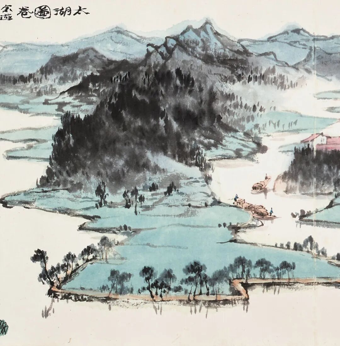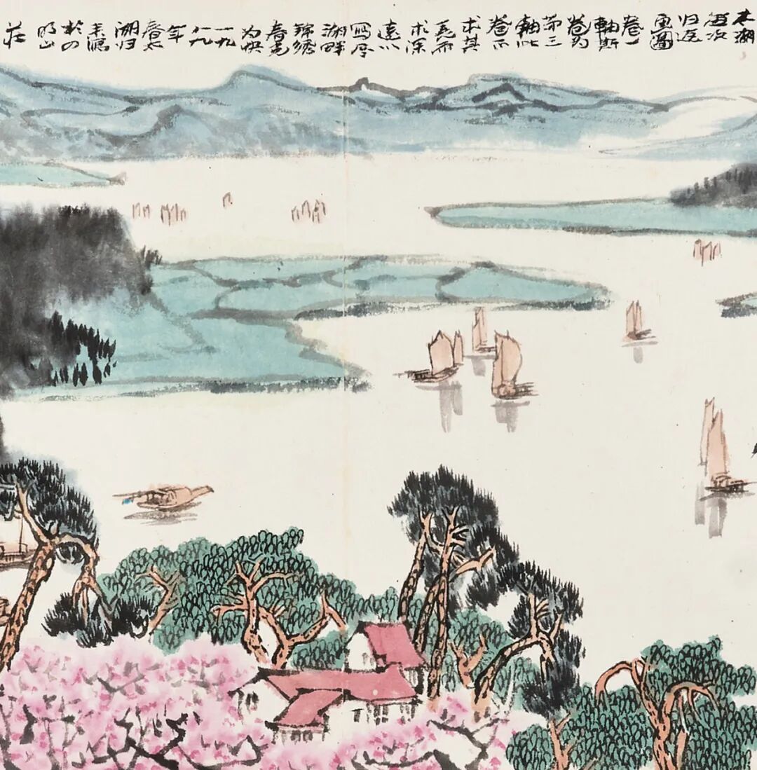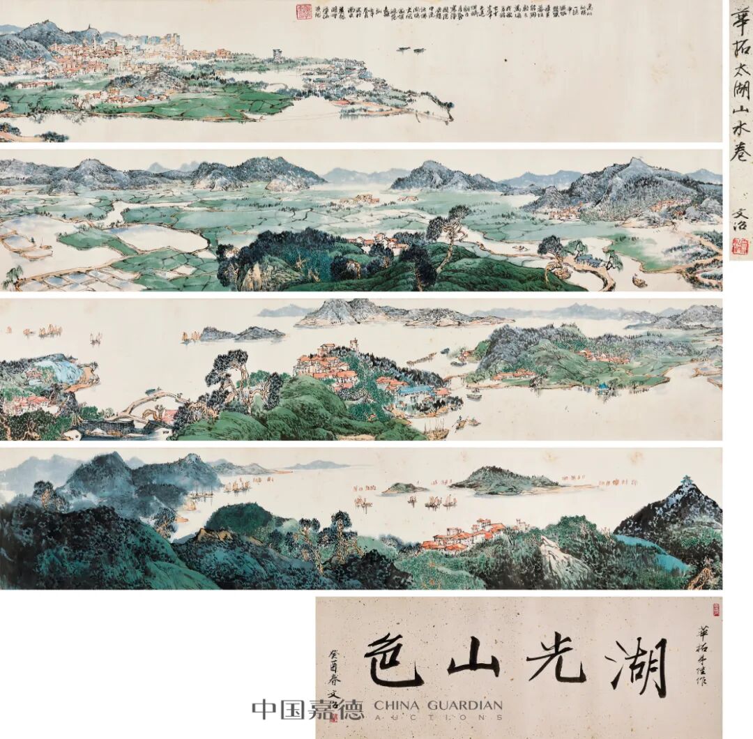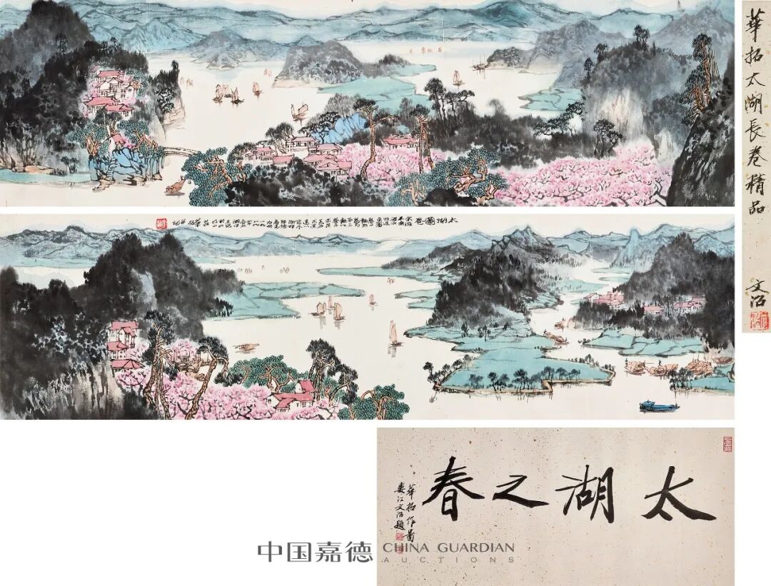 题识:太湖图卷。余游太湖,每次归返,画图卷一轴,斯卷为第三轴,此卷不求其长,而深远,以写尽湖畔锦绣春光为快。一九八九年春,太湖归来写于四明山庄,华拓并记。