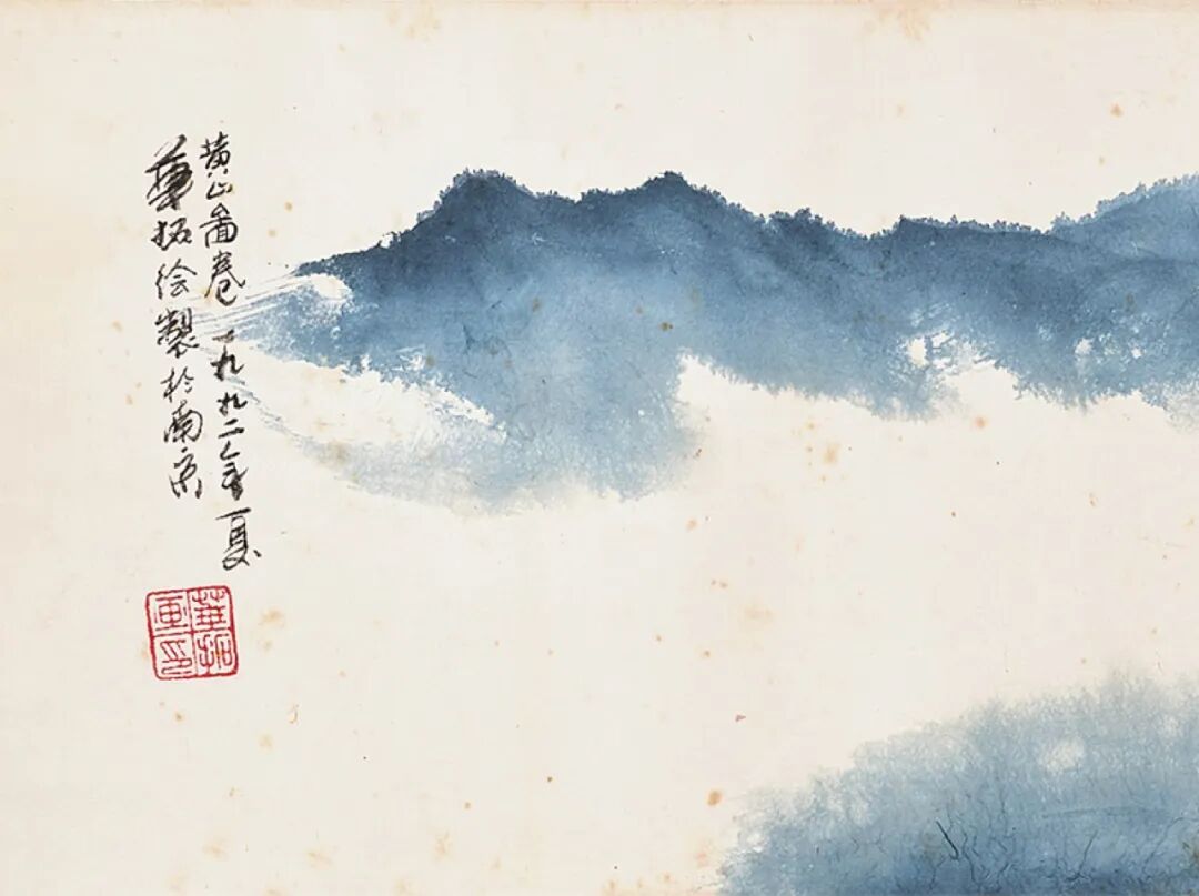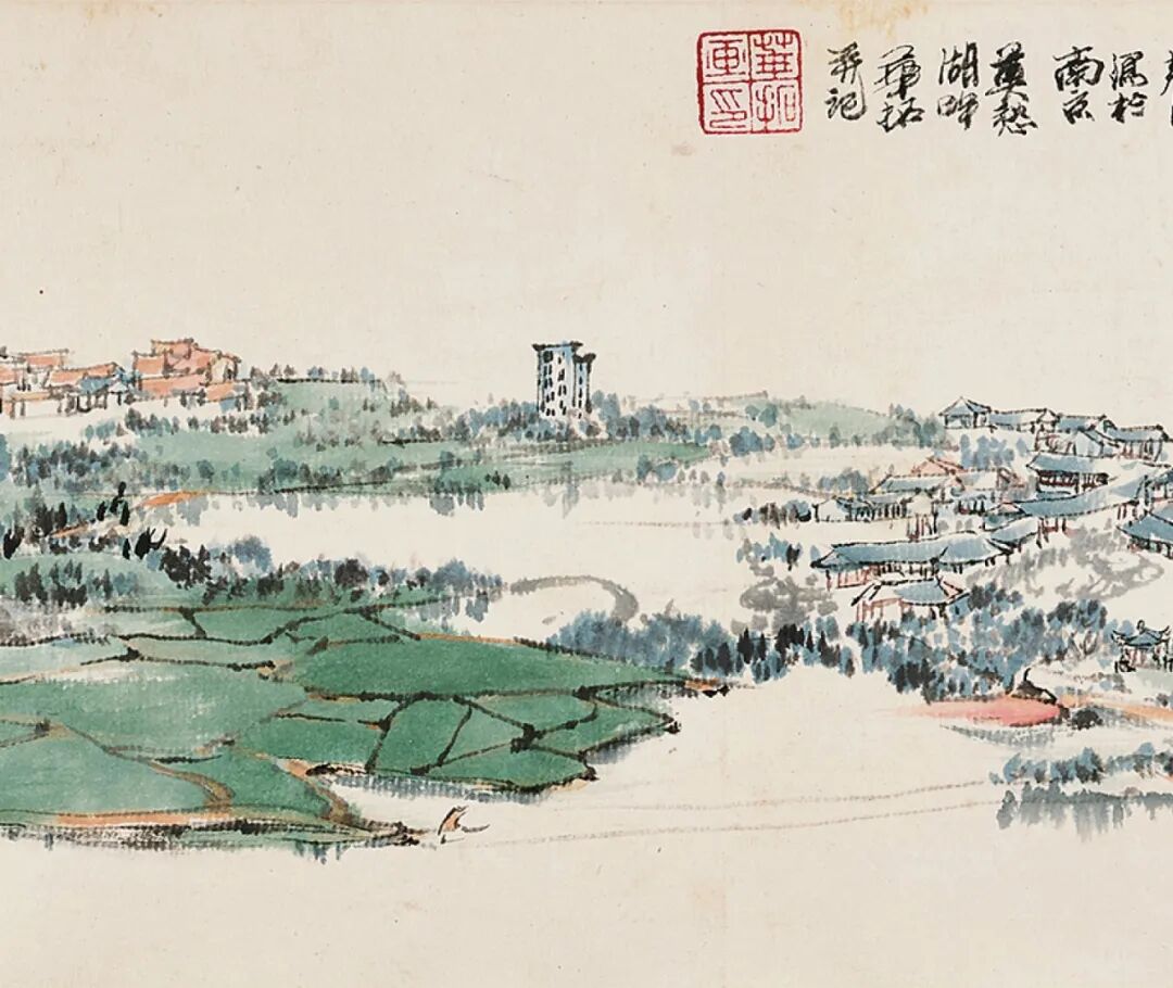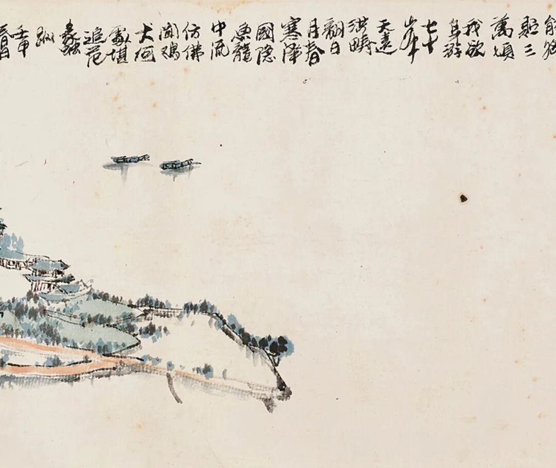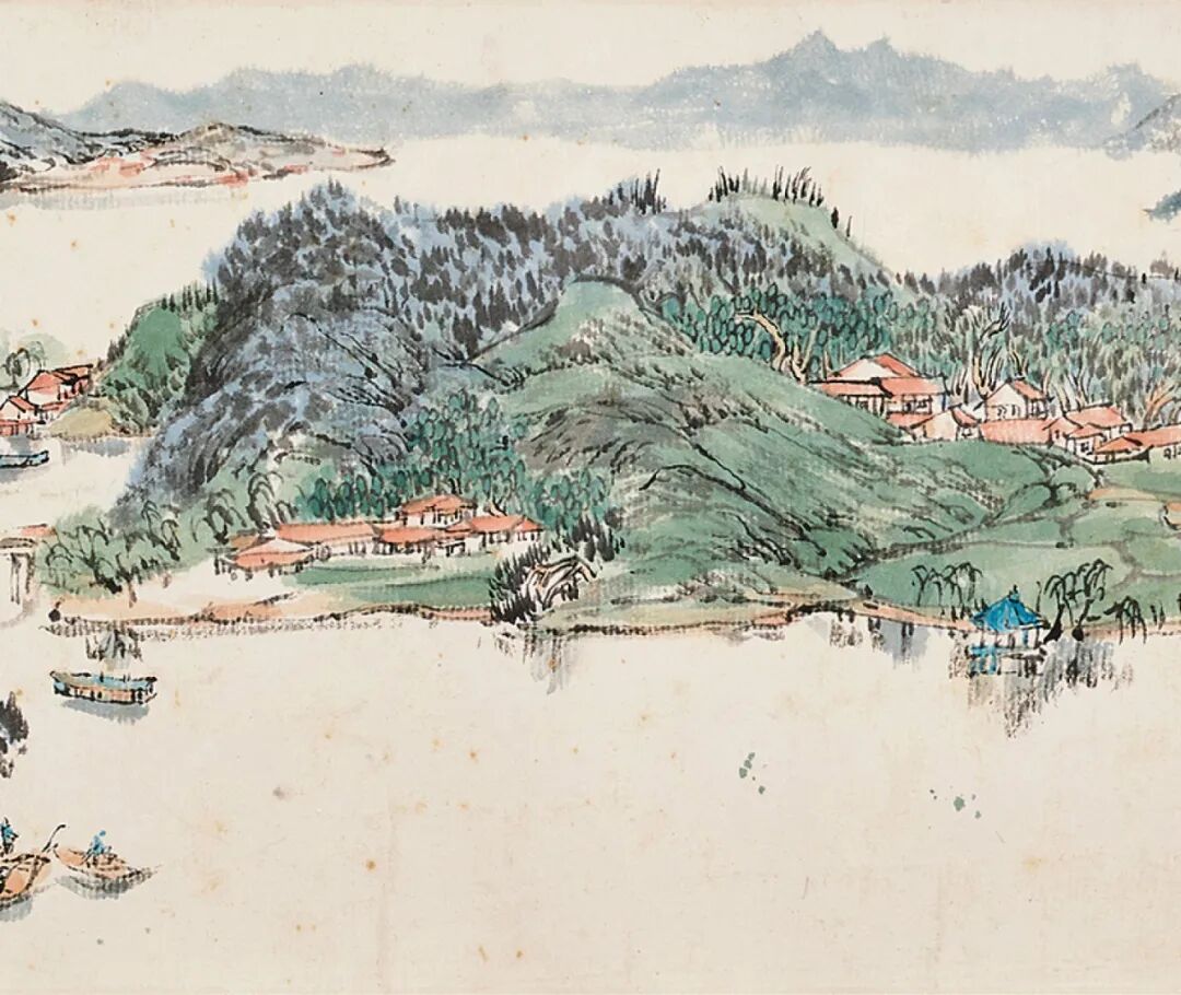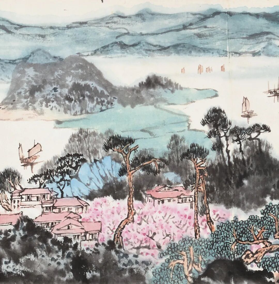 题识:太湖图卷。余游太湖,每次归返,画图卷一轴,斯卷为第三轴,此卷不求其长,而深远,以写尽湖畔锦绣春光为快。一九八九年春,太湖归来写于四明山庄,华拓并记。