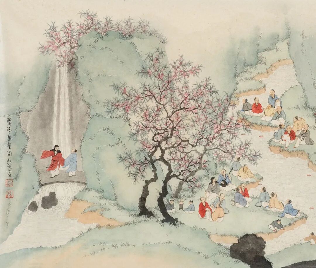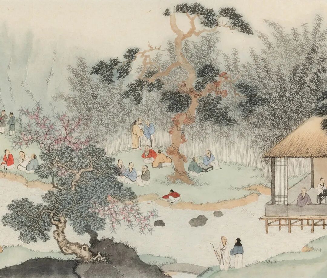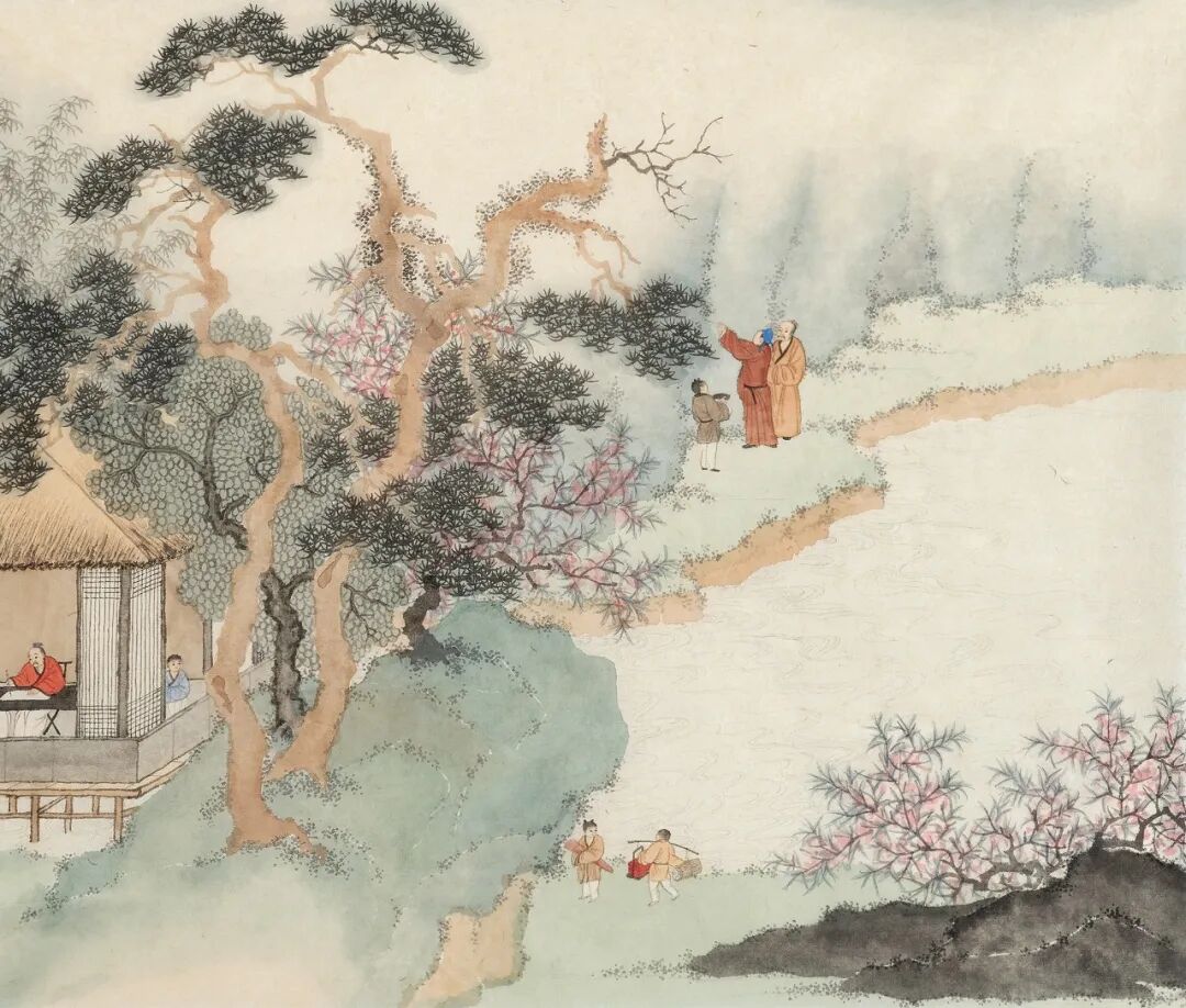 题识:艺林堂设想图。艺林堂者,不知其何属也,已不知其年岁。所筑堂不大也不小,远离尘嚣,依山傍水,冬暖夏凉。时有远朋雅集于此。啸风赏月,陶情乐趣。其时心旷神怡,琴者歌其曲,棋者逸其志,书者抒其怀,诗者诵其天。尽忘却人间烦恼,真难得之福地也。陶斋先生曰天地者,万物之逆旅也,光阴者,百代之过客,而浮生若梦,为欢几何。于是置酒食于案上,一时醉者睡,欢者笑,悲者唱,曾不知月落又东升,月缺又重圆。风晴雨雪,不肯归去。予爱其朴,欲寻照相机摄之,忽见长空一鹤,戛然而过。斯觉一梦,因追画之,欲与有缘者明日共寻宝地筑之一笑。庚午,二刚于镇江。