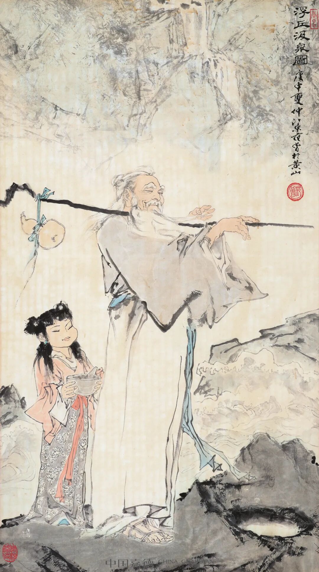 题识:浮丘汲泉图。庚申夏仲,江东范曾于黄山。