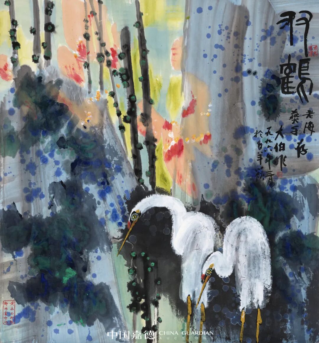 题识:双鹤。老海、燕子存。大伯作,一九九六年三月于百羊岭。
