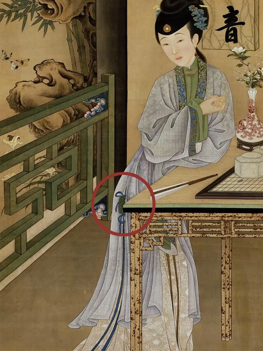 画中童子腰上挂着深色荷包,可以看到荷包上有精美的刺绣图案。