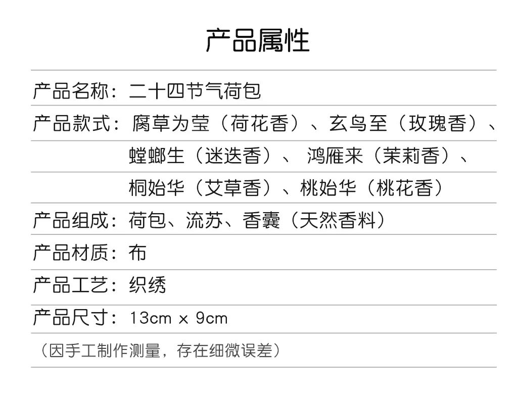 荷包内囊装有天然香料,将二十四节气化作天地万物的香气,每个细节,都可体会中华传统之美。