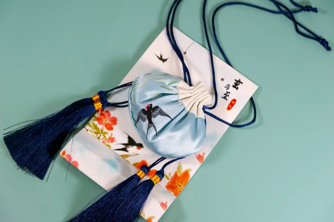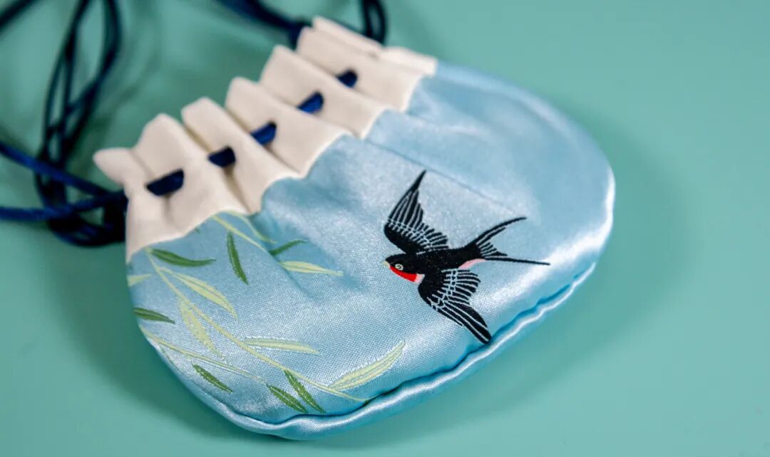 玄鸟至荷包,灵感同样来源于二十四节气中的白露节气,其“玄鸟至”,正是白露中的二侯。主色调为水蓝色,错落的柳叶以黄金比例构图,姿态优美,立体生动。