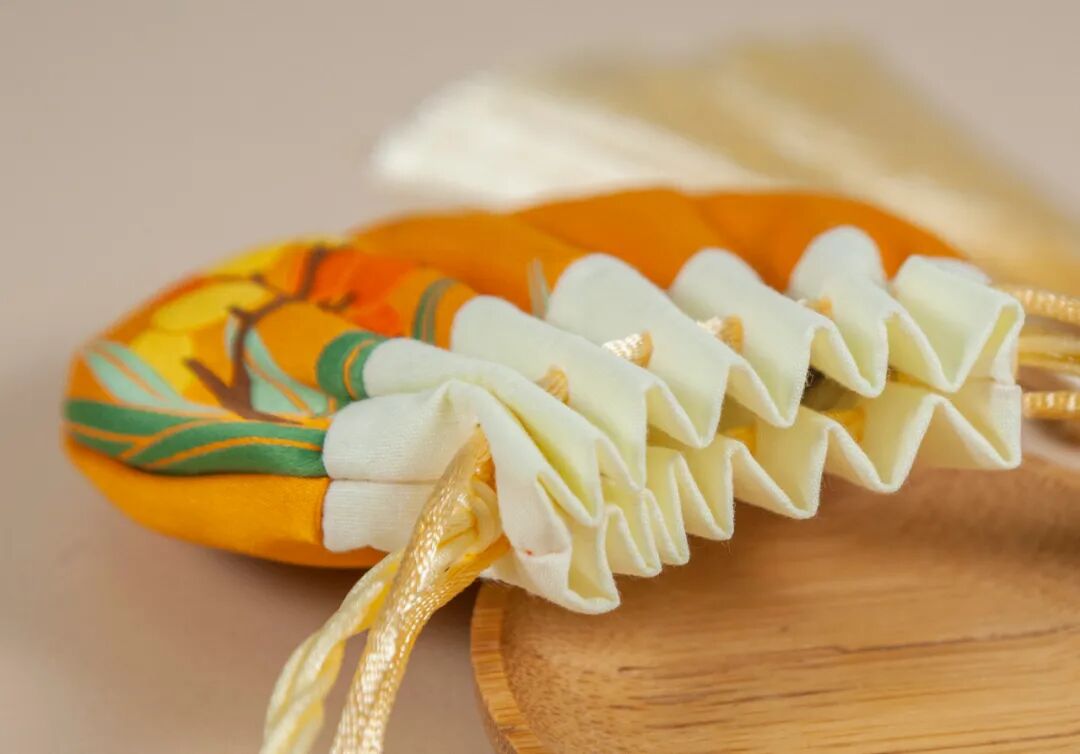 芒种,是一个丰收与播种并存的大好时节,因此荷包特别采用麦穗色作为主色,寓意一分耕耘,一分收获。