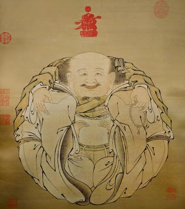 故宫博物院藏有宪宗皇帝《一团和气图》御笔,画面上粗看似一笑面弥勒盘腿而坐,体态浑圆,细看却是三人合一, 惠远法师、陆修静、陶渊明三人“霭一团之和气 ”,精妙绝伦。人物刻画生动传神,衣纹细劲流畅,顿挫自如,显示出作为画家的朱见深的匠心巧思与高超技艺,体现了作为皇帝的朱见深希望三教合流、和睦相处、朝野安定、国泰民安的思想。明成化 御笔 一团和气图