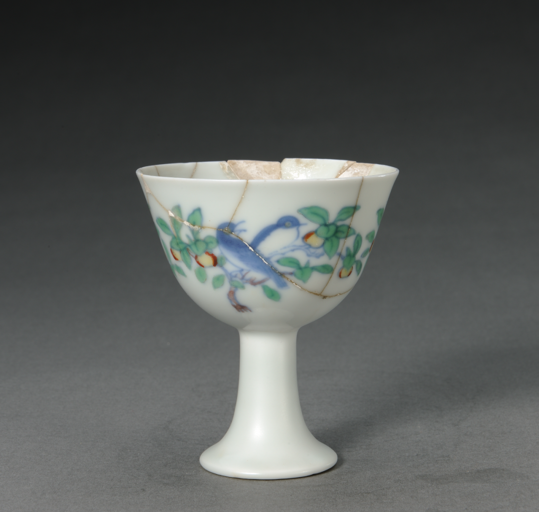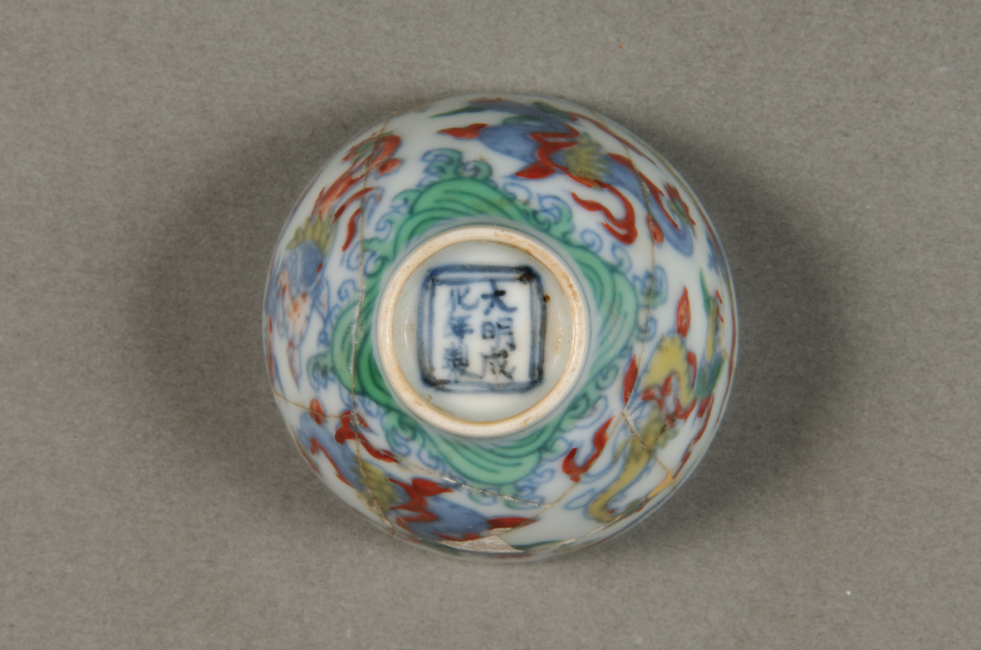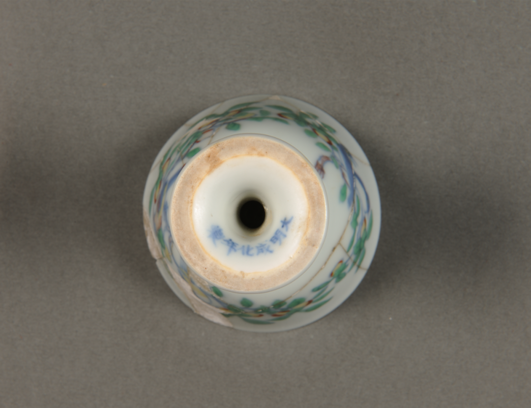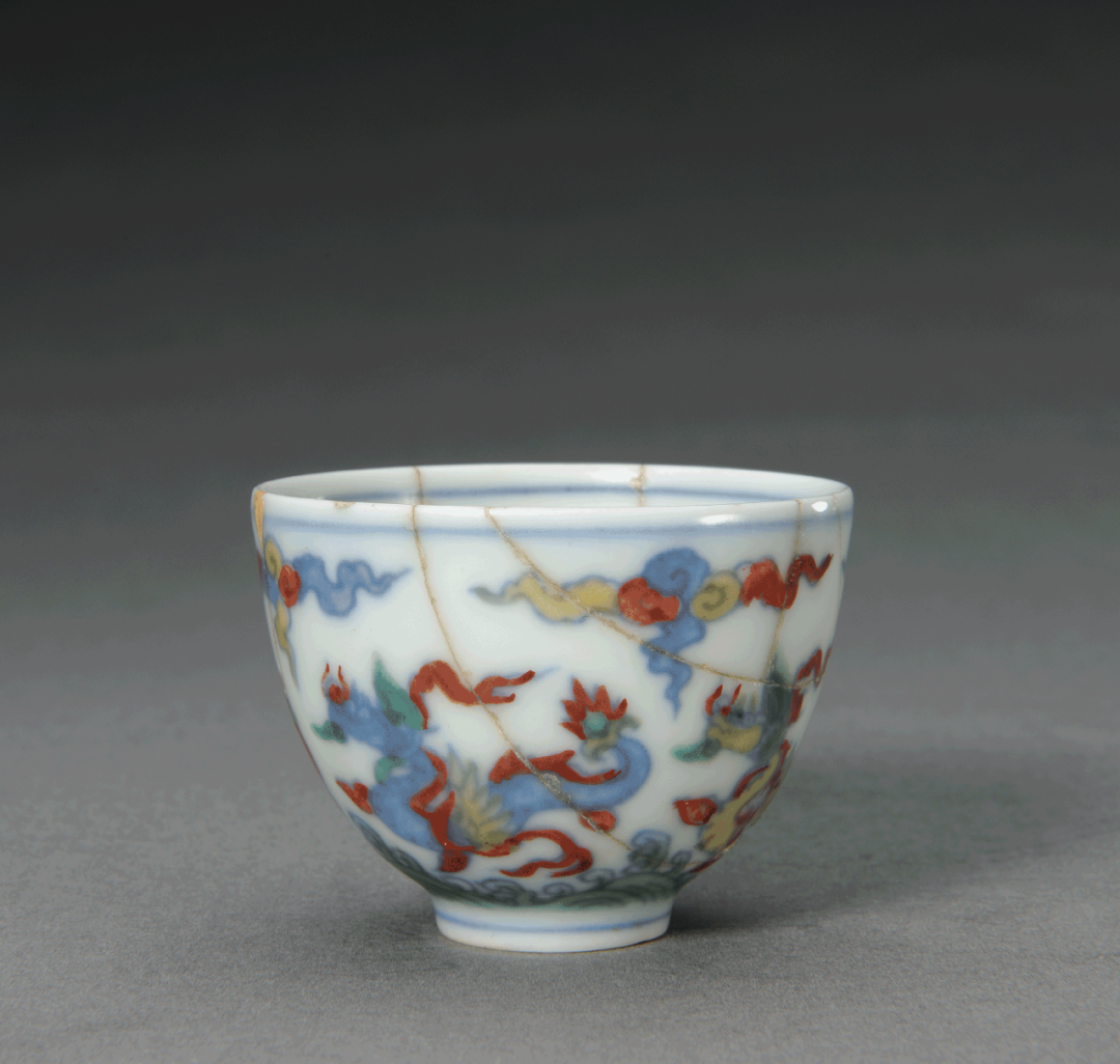 成化皇帝的一生几经起伏,幼年时由土木之变至夺门之变,两次被立为太子,期间一度被幽禁数年,时刻有性命之虞,生活在惶恐之中,只有年长他十七岁的宫女万贞儿照料呵护,直至他登基称帝,万贞儿被立为贵妃,极受宠爱,他们之间专情、痴情的情感故事可称传奇,成化御窑中最为知名的斗彩鸡缸杯传说即与万贵妃的喜爱有关。此式小杯制作极为精巧,存世珍罕,数百年来享负盛名,上至宫廷、下至民间,天下慕向,诚为中国瓷器收藏家梦寐以求之品。清人朱琰《陶说》中评述此杯说:“成窑以五彩为最,酒杯以鸡缸为最。”关于其价值,明代沈德符《万历野获编》中写到:“至于窑器,最贵成化,次则宣德。杯琖之属,初不过数金,……顷来京师,则成窑酒杯,每对至博银百金,予为吐舌不能下。”可见其贵重。存世私人收藏之成窑斗彩鸡缸杯仅有四件,其一由龙美术馆于2014年以2.8亿港币纳入馆藏。展览中展出了1990年和2003年珠山御窑出土的鸡缸杯残器两件,及更为方家所重的斗彩花鸟高足杯、斗彩应龙杯珍器,可一窥名品之风采。![]()