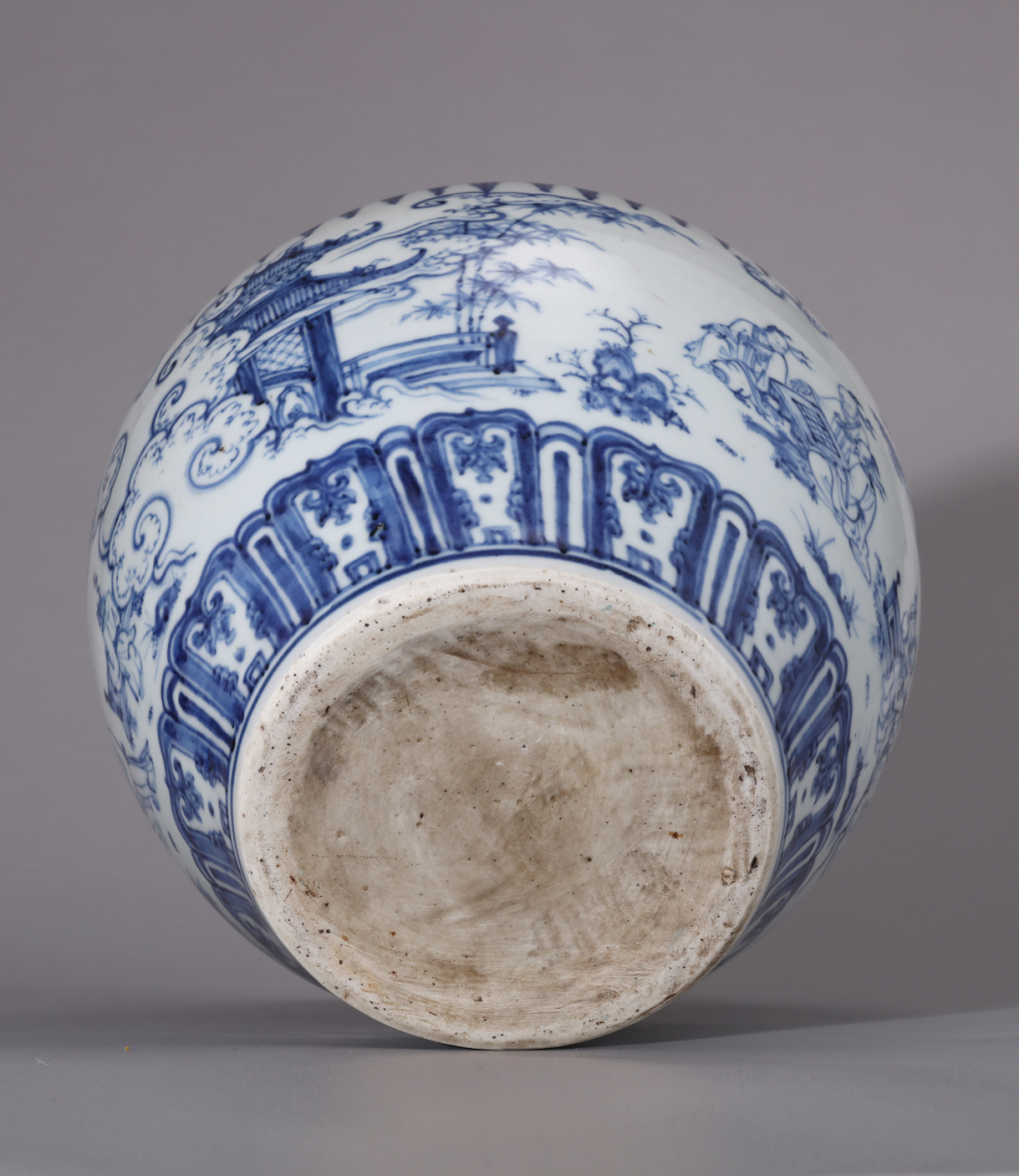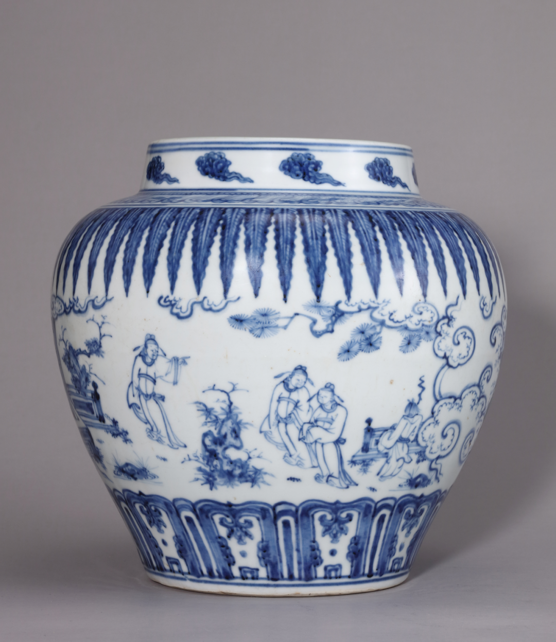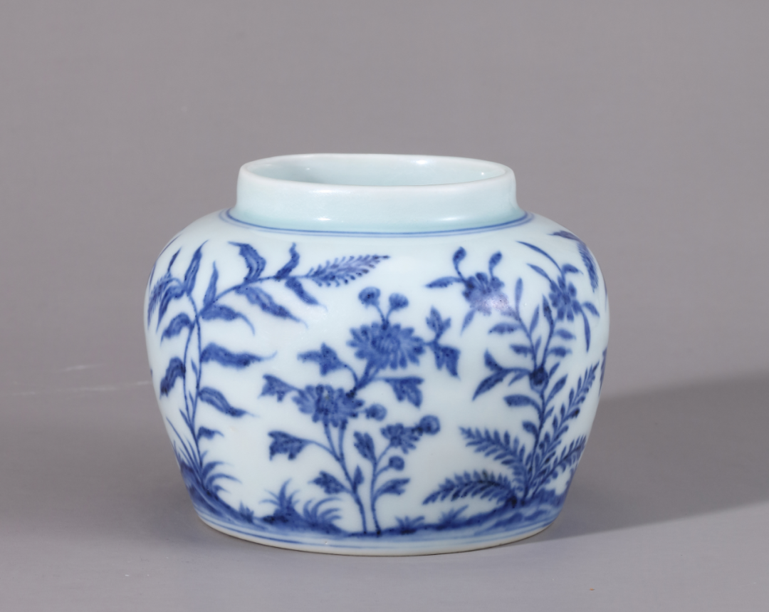 展览中的明成化“竹溪六逸”雅集图罐,或许是“文人皇帝”对理想生活的一个注脚,竹溪六逸指的是唐开元二十五年,李白移家东鲁,与山东名士孔巢父、韩准、裴政、张叔明、陶沔在山东徂徕山竹溪隐居,他们在此纵酒酣歌,啸傲泉石,举杯邀月,诗思骀荡,世人皆称他们为“竹溪六逸”。后世文人仰慕他们狂放不羁、悠然自得、不被俗世束缚的生活方式,常以其自况,渴望追寻这种自由浪漫的生活状态。这是一件别有意趣的成窑佳作,其绘画精妙,线条流畅,笔法以白描为主,迤逦的流云将画面分隔成两个场景,一侧庭院中有二人对坐弈棋,另一人陪坐观战,有两总角童子立于一旁随侍,一人持手杖,一人抱古琴;另一侧绘一人立于楼阁石阶前,回首平举左手指向远处,似在大声吟诵诗篇,不远处站着的两人正在倾听品味,后又有一童子侍立,整个画面构图疏密有致,极见章法,尤其是借用连续的云气纹使树石楼阁自流云中隐现、同时将画面分隔为不同场景的手法十分巧妙,极富戏剧效果,仿佛观看一出舞台剧一般。同样富有温婉文人气韵的,还有一件青花九秋图罐。造型饱满精巧,胎釉细润晶莹,外壁以青花绘菊花、石竹等盛开的花卉,间绘蝴蝶翩跹翻飞,摇曵飘香,青花呈色浅淡柔和,典雅宜人,纹饰采取双线勾勒填色绘制技法,画工规整,笔触秀丽,疏密有致,线条优美自然,洋溢着无限生机。