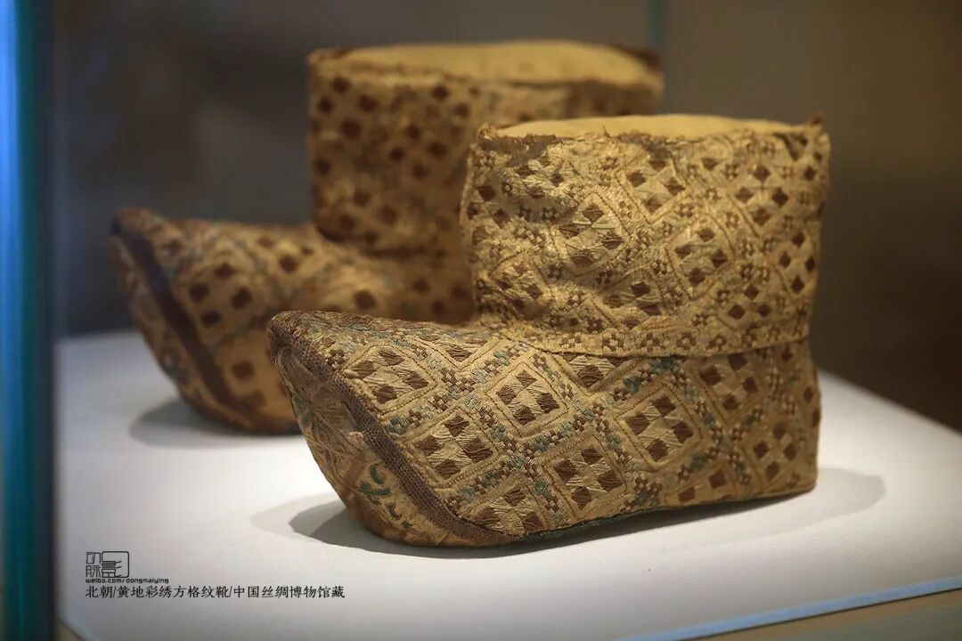 北朝 黄地彩绣方格纹靴 中国丝绸博物馆藏