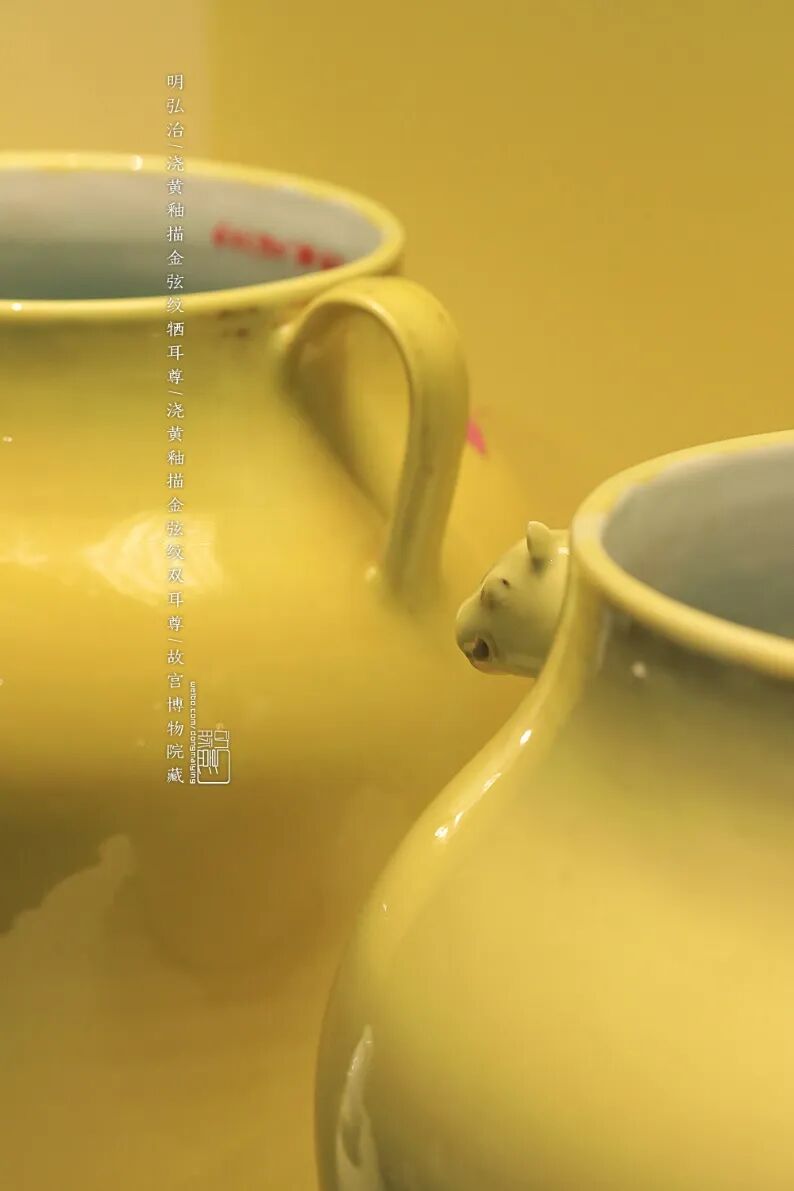明 弘治 浇黄釉描金弦纹牺耳尊(右前)