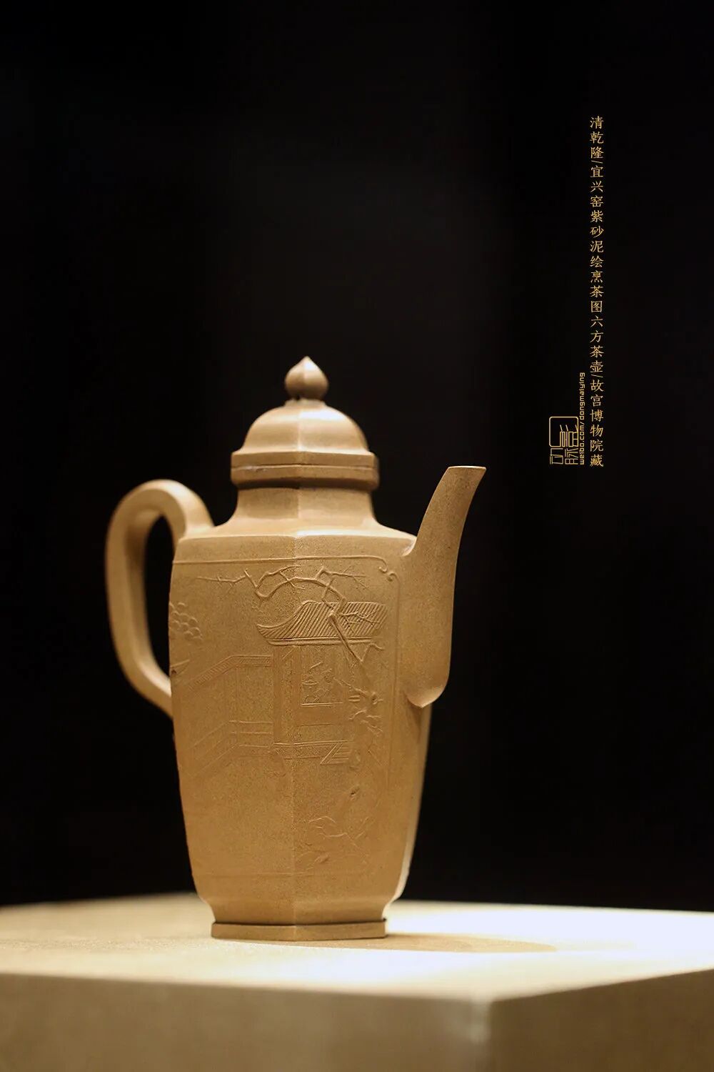 清 乾隆 宜兴窑紫砂胎泥绘烹茶图题乾隆御制诗文六方执壶 故宫博物院藏