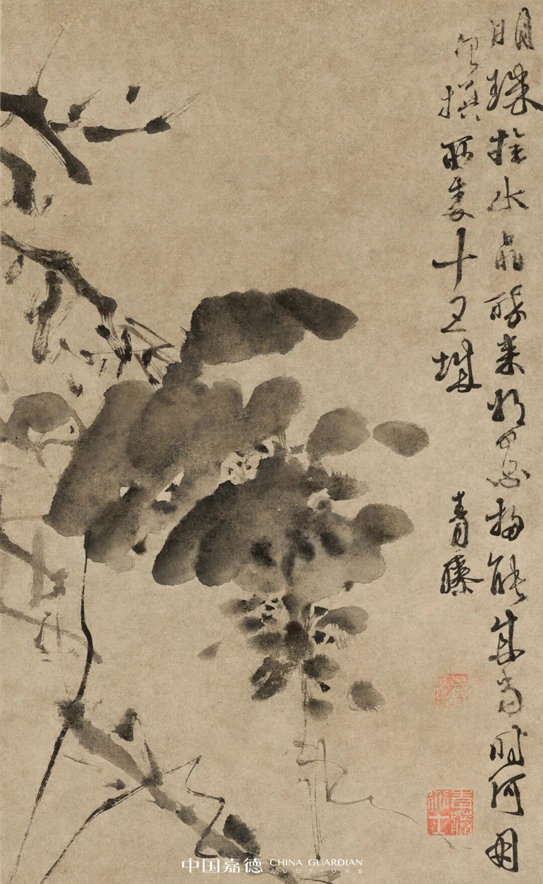徐渭于五十余岁居“梅馆”时,小书斋的窗外种葡萄一架,于是他对葡萄有很细的观察,也好作墨葡萄。他信笔挥洒,脱略形似,藤条错落低垂,枝叶纷披,以豪放泼辣的水墨技巧造成动人的气势和葡萄晶莹欲滴的效果。画上书法往往字势斜欹跌宕,与画相映成趣,充盈着一种强烈的情感,令人联想起画家的不平经历。