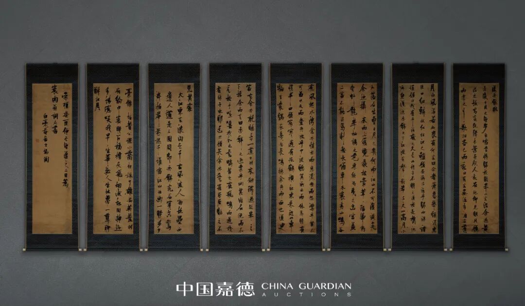 张瑞图与邢侗、董其昌、米万钟并称“明末四大家”,其书迹流传至日本,对日本书坛影响甚大。明朝末年,福建高僧隐元和尚隆琦把张瑞图的书法带去日本。此前,日本一直对于晋、唐精致典雅的书风比较熟悉,初见张瑞图的“奇逸”书体,大开眼界,十分着迷。又因张瑞图字“二水”,被誉为“水星”,认为他的书法挂在屋中,能去灾避火厄,对他推崇备至。故日本人大肆购藏了很多张瑞图的精品,加上在异国不会受到政治的抨击,而使作品得到更好的保存。此套八屏,亦曾东渡日本,被视为珍品,现为日式装裱,每两个分装在木盒中,盒内有昭和廿四年(1949)芝翁堂题跋。